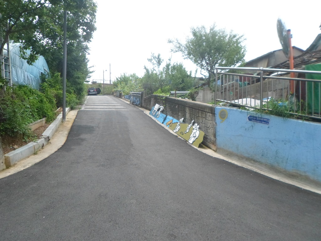 아래그림/골목길로 내려오니 마을진입길을 만난다.정면으로 이정표도 보인다.左측으로 간다.