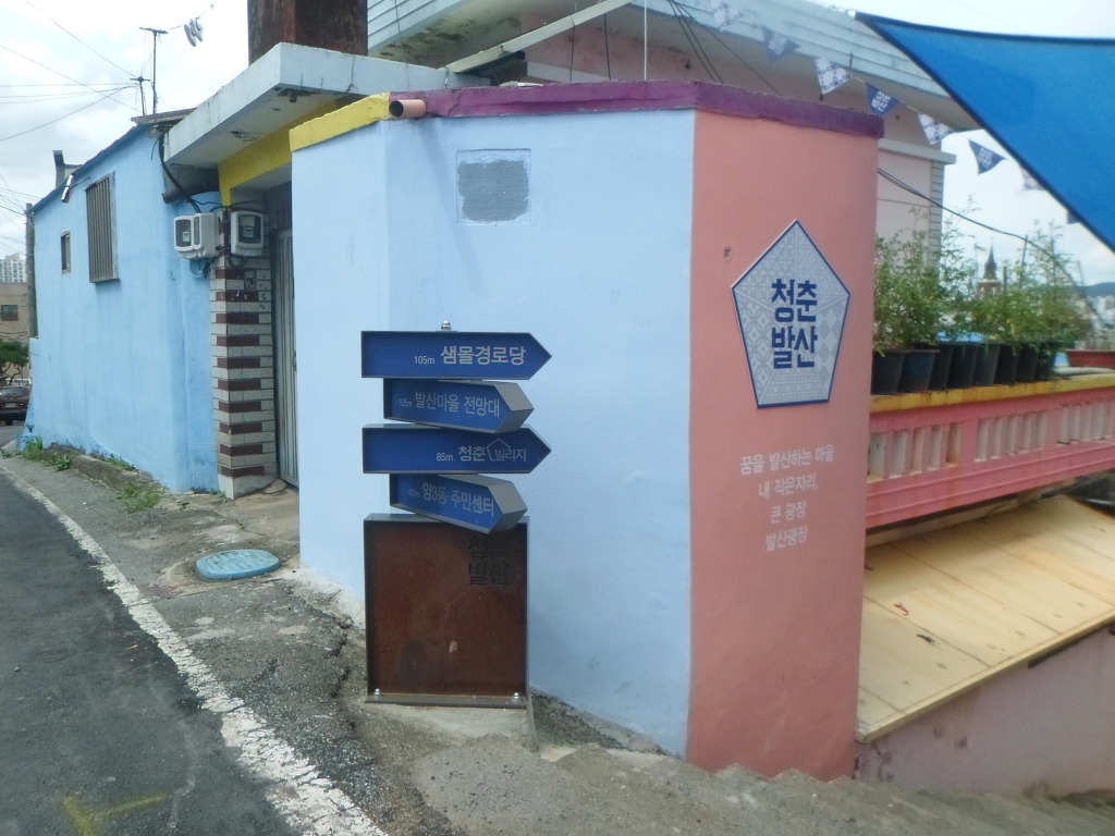 아래그림/발산상회옆의 이정표다.[샘물경로당]쪽으로 골목길로 내려간다.