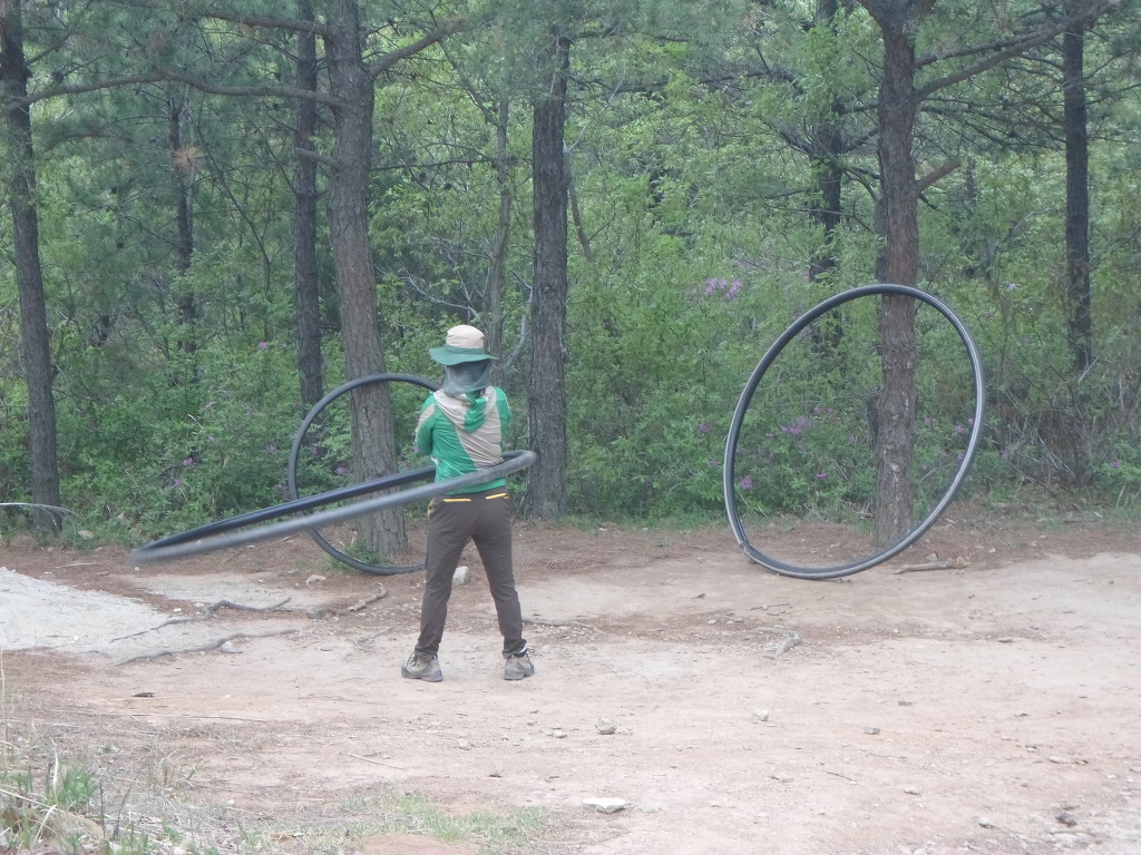 아래그림/여성등산객이 엄청큰 훌라호프를 엉덩이를 슬적 슬적 돌리니 돌아가고 있다.