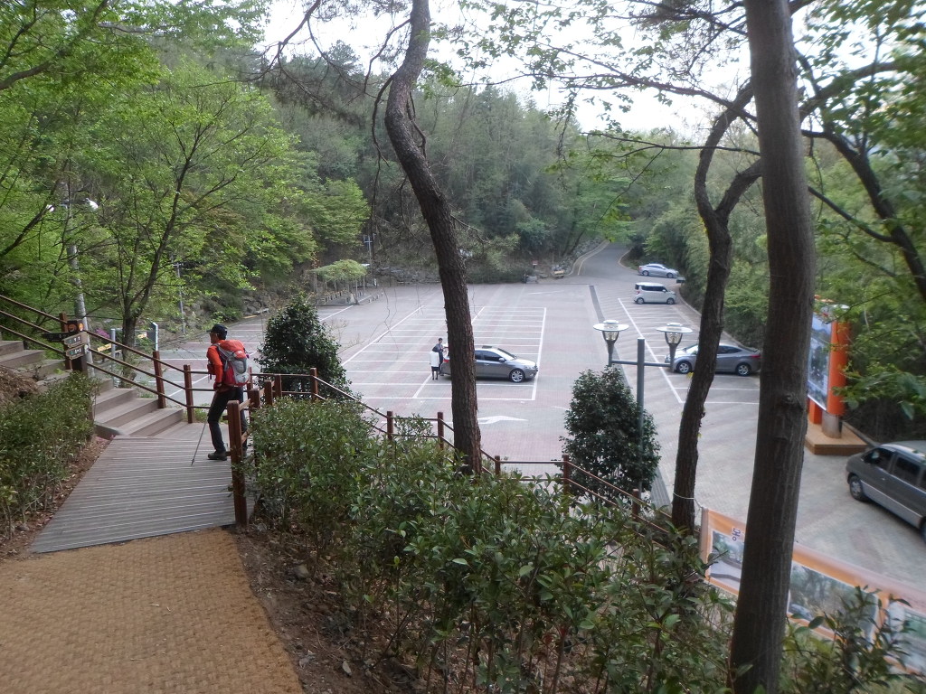 아래그림/[김종표]씨가 서있는 곳에서 左측으로 [등산로]표시다.[죽도봉주차장]에서 아스콘도로 따라 내려가면