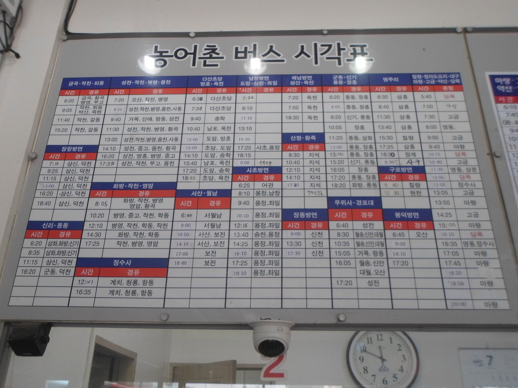 아래그림/강진터미널에 있는 군내버스 시간표 인데~판독이 어렵다.[칠량-저두-대구-마량]행 군내버스를 타야 한다.