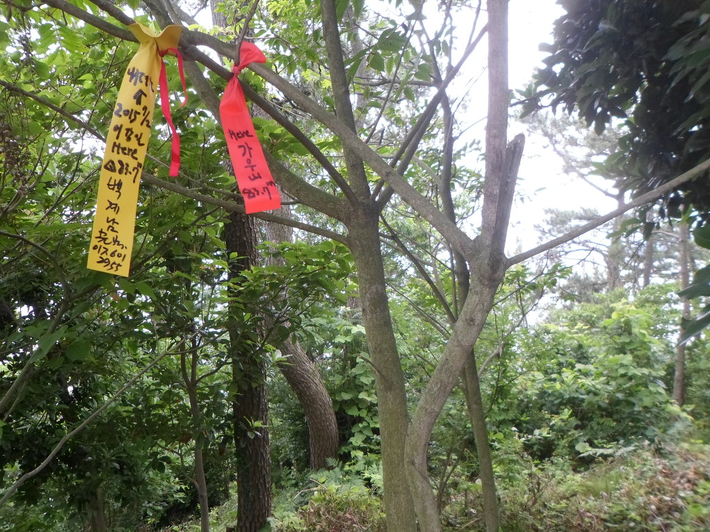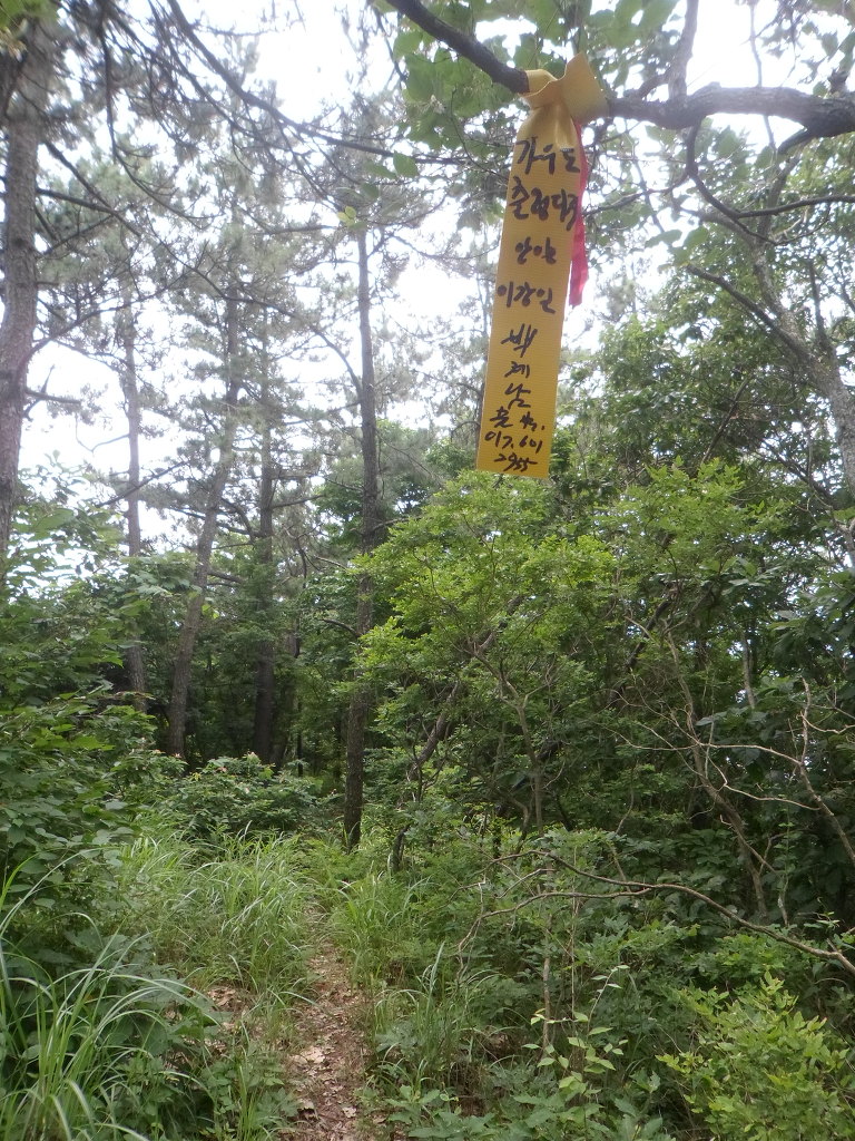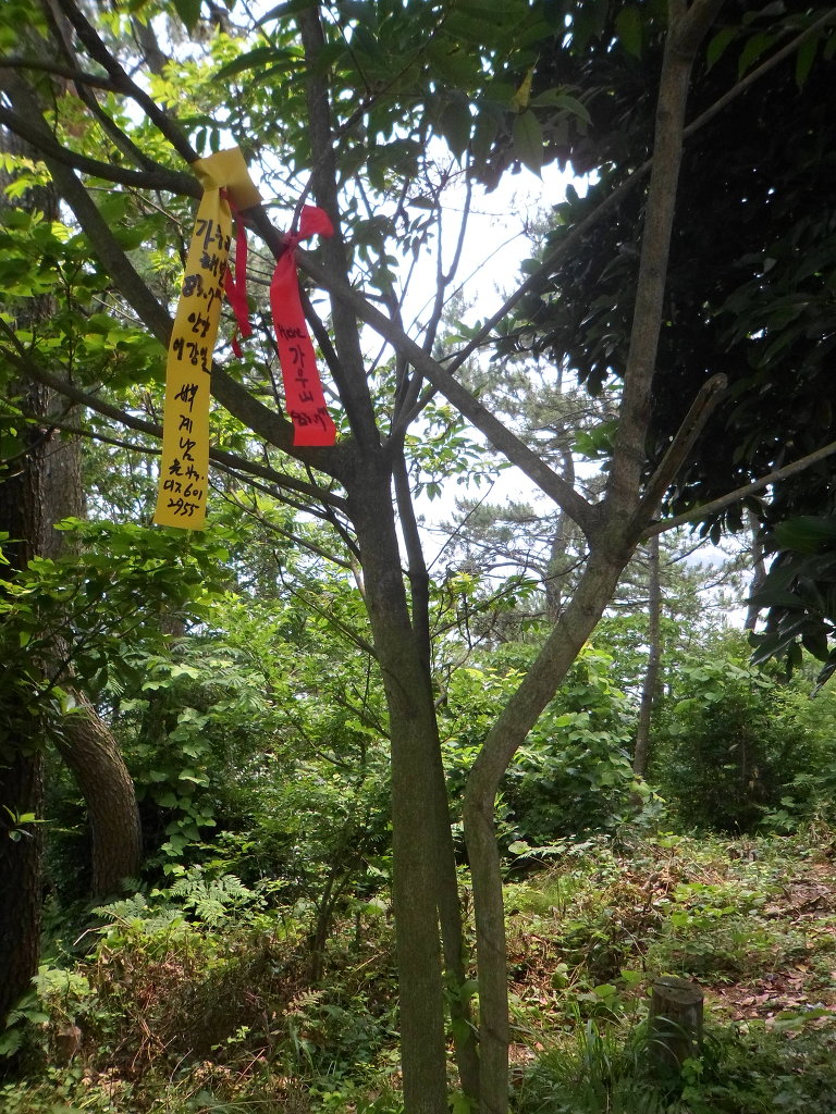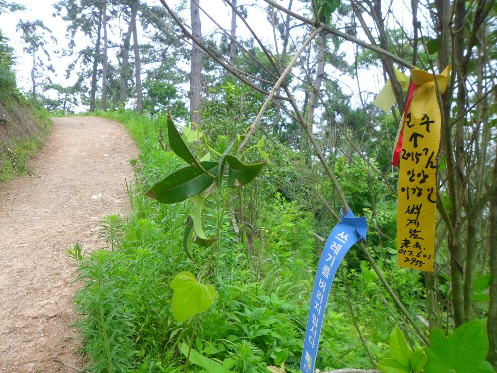 아래그림/정상에 표시리번 매단다.다시 공사장쪽으로 회기 한다.[저두출렁다리]를 지난후 우측으로 잠시 가면 좌로 통나무계단이