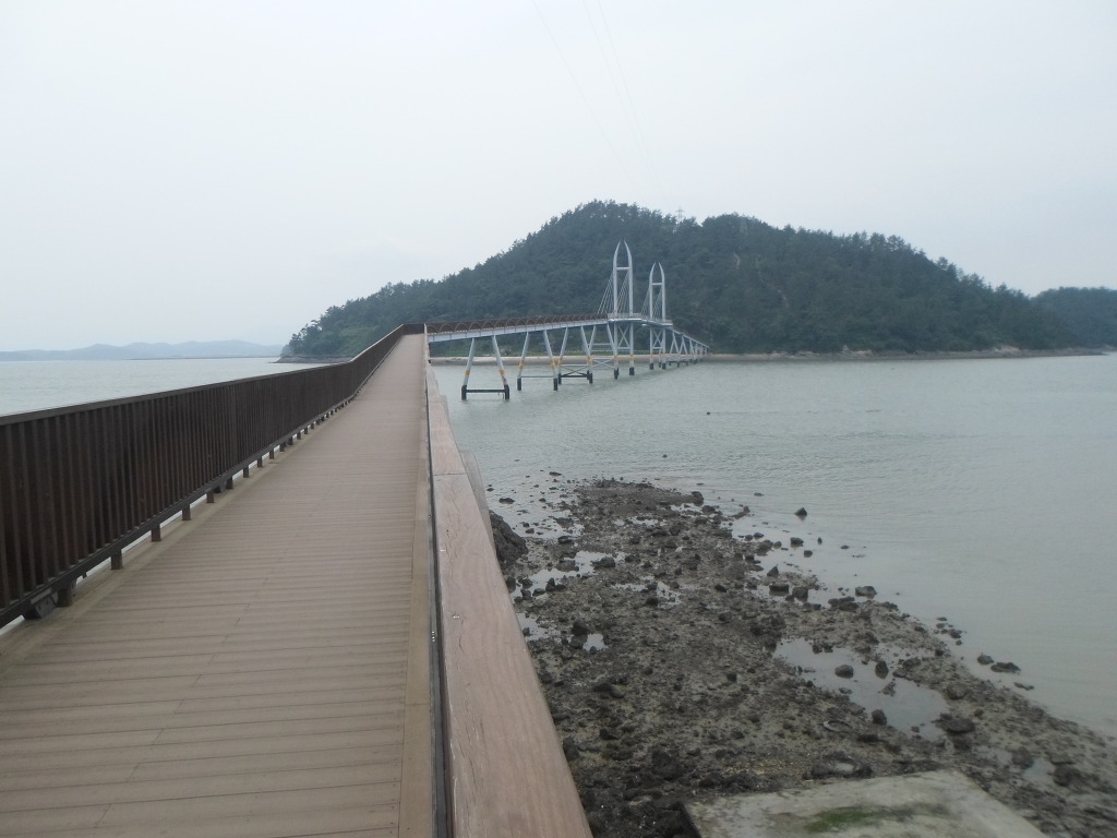 *13시45분이다.아름답게 휘어져 건설됀 다리를 左,右로 바다를 보면서 건너간다.右측 멀리 [주작산-덕룡산]이 희미꾸리한