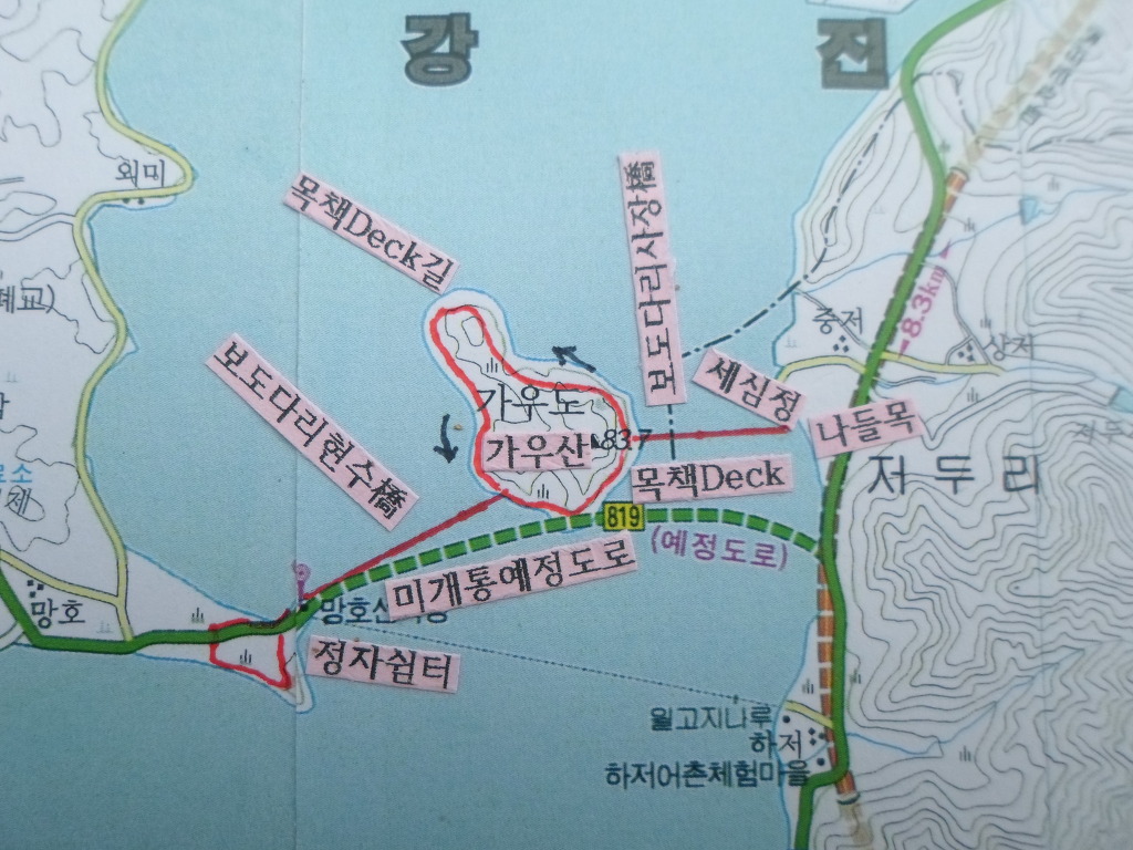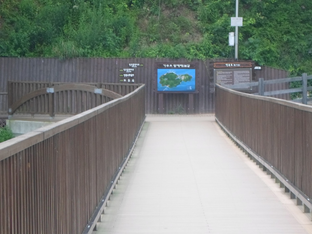 다리길이가 438m인 다리를 건너가면 右측으로 잠시 진행하면 左로 가우산정상(83.7) 올라가는 통나무계단이 보인다.약15분정도