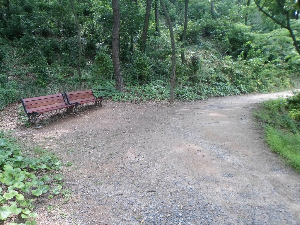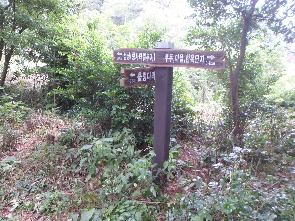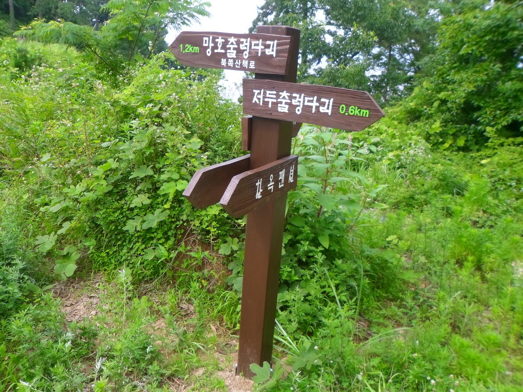 이다.바로 내려가면 시멘트임도를 만나고 이정표도 보인다.임도를 지나 북쪽산책길로 간다.여기 이정표에서 左로 산등성이 넘어가면