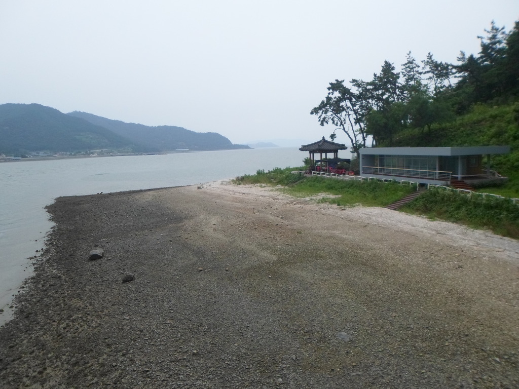 바다을 右로 끼고 일주길로 진행을 하면 멀리 [주작산-덕룡산]줄기가 우람하게 보인다.일주길 左로 한옥과 마을이 보이는 [가우리