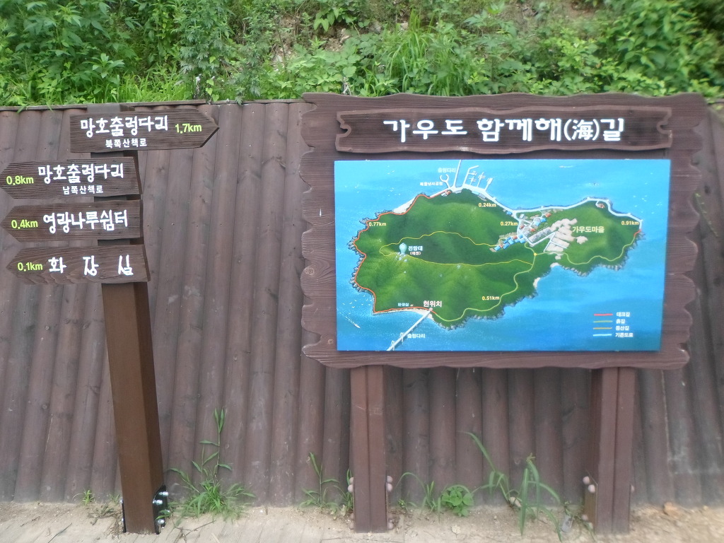 아래그림/[저두출렁다리]를 건너가면 산아래에 안내도가 보인다.여기서 반듯이 右측으로 가야 [가우산]정상에 오를수가 있다.