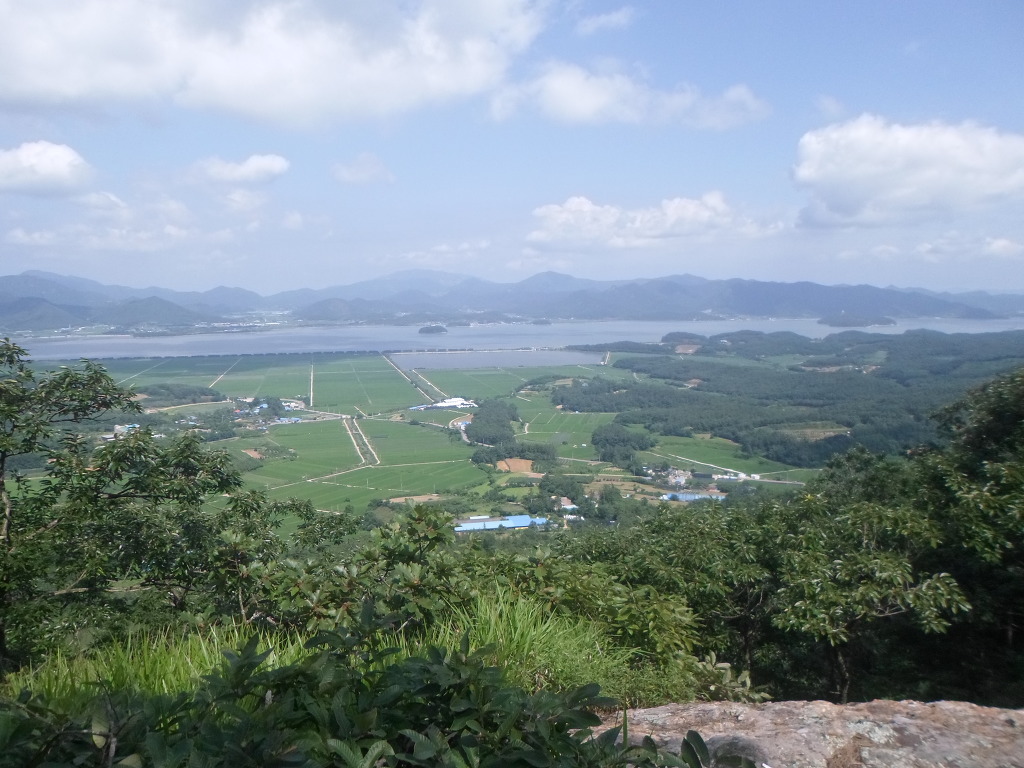 아래그림/右로 개활지와 도로가 보이는 안부에 있는 이정표가 옳게 가고 있슴을 보여준다.오솔길로 올라간다.