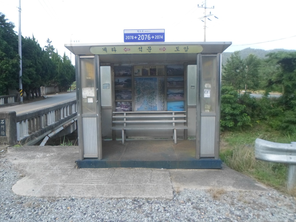 아래그림/삼거리에 있는 버스정유장인데 18시30분에 버스지나가고 *[도암]출발 막버스가 19:00경에 있다고 한다.[강진]까지 택시