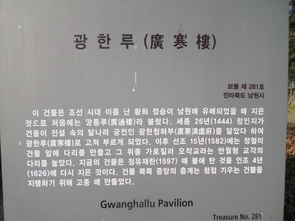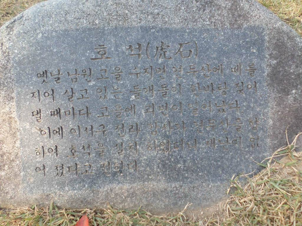 어린시절 부모님이 장을 보려 여기까지 따라와 장을 보면서 여기서 놀고 하였는데 이런 호석을 광한류원 확장공사로 완월정 업으로 올기다가 학생들이 수학 여행을 가는데 열차가 탈선하여 여러명이 죽고 팔다리가 절단 되는 사고 있었으며 죽은 자는 노암도 승사고 다리우개 모시어저 있었으며 인터냇을 보고 남원시청에서 주변둥에 풀도 깍거 주었다,