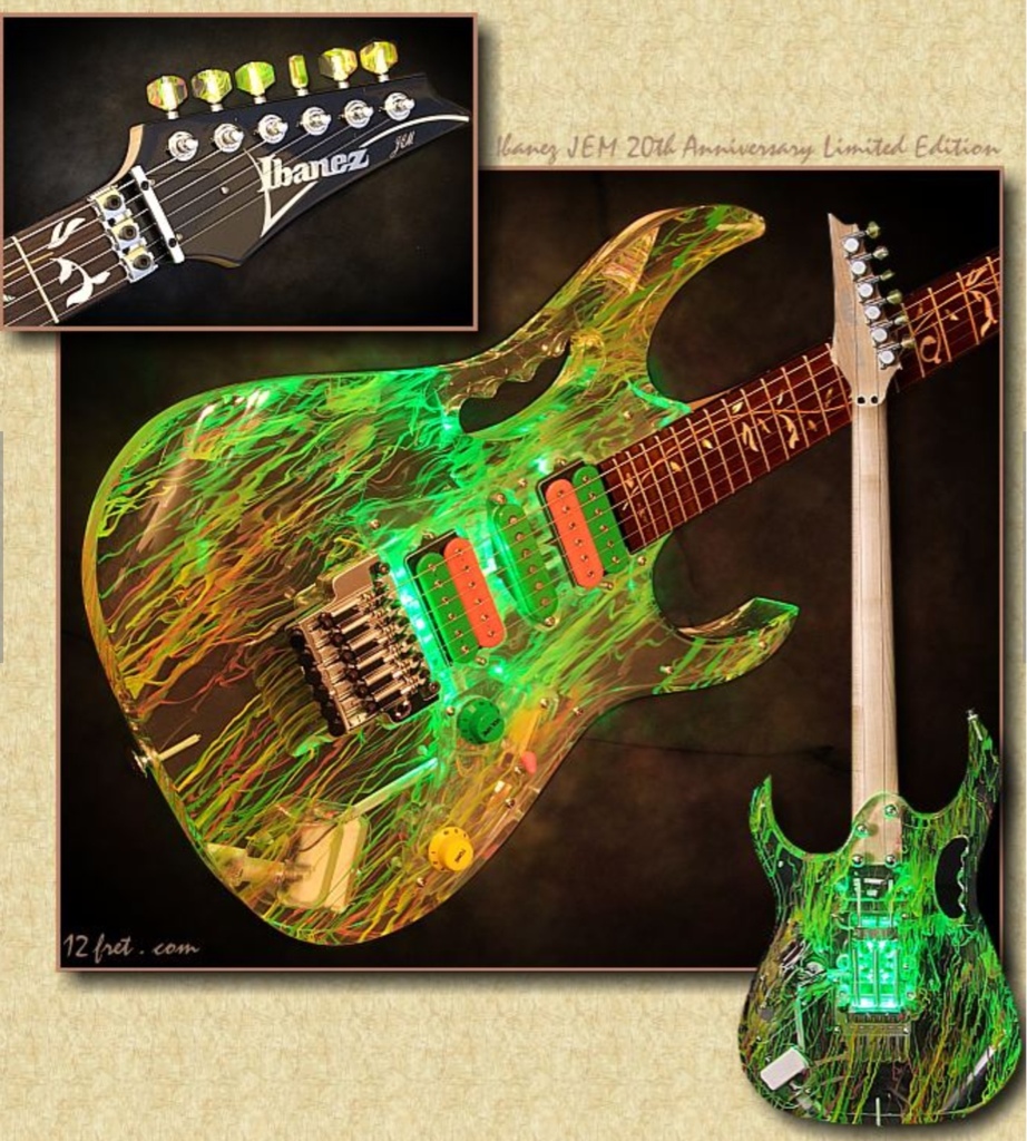 사진의 기타는 IBANEZ 20주년 기념 한정판 모델의 기타인데 바디의 디자인을 소재로 과감하게 표현하였다..