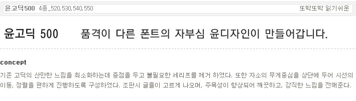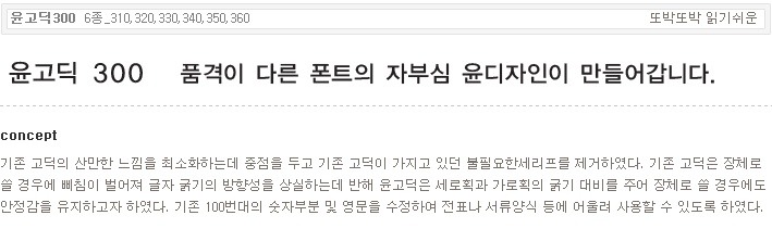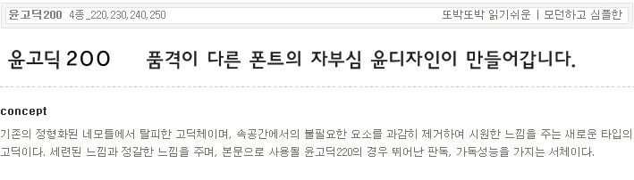 서체명 : 윤고딕200 [4종_220,230,240,250] 출시년도 : 2000 컨셉 : 기존의 정형화된 네모틀에서 탈피한 고딕체이며, 속공간에서의 불필요한 요소를 과감히 제거하여 시원한 느낌을 주는 새로운 타입의 고딕이다. 세련된 느낌과 정갈한 느낌을 주며, 본문으로 사용될 윤고딕220의 경우 뛰어난 판독, 가독성능을 가지는 서체이다.