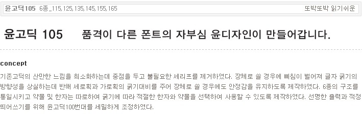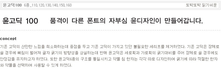 서체명 : 윤고딕100 [6종_110,120,130,140,150,160] 출시년도 : 1994 컨셉 : 기존 고딕의 산만한 느낌을 최소화하는데 중점을 두고 기존 고딕이 가지고 있던 불필요한 세리프를 제거하였다. 기존 고딕은 장체로 쓸 경우에 삐침이 벌어져 글자 굵기의 방향성을 상실하는데 반해 윤고딕은 세로획과 가로획의 굵기대비를 주어 장체로 쓸 경우에도 안정감을 유지하고자 하였다. 또한 윤고딕6종의 구조를 통일시키고 약물 침 한자는 각각 따로 디자인하여 굵기에 따라 적절한 한자와 약물을 선택하여 사용할 수 있게 하였다.