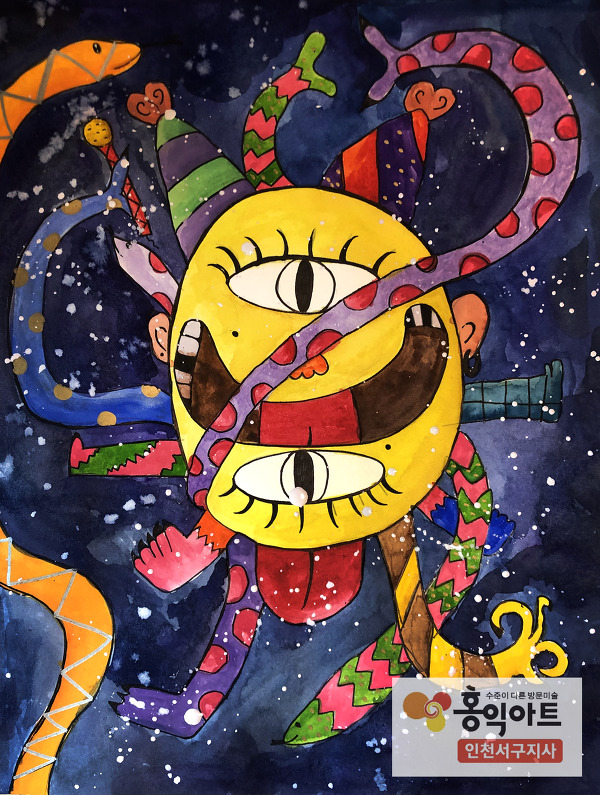 우연의 수를 얻어 그 수틑 바탕으로 괴물의 모습을 상상하며 그려보았네요!! 주사위놀이를 통해 흥미와 재미를 느낄수 있어 수업 집중도는 올라가고, 자유롭게 상상하며 그림을 표현하다보니 창의력을 키울 수 있는 수업이였어요.