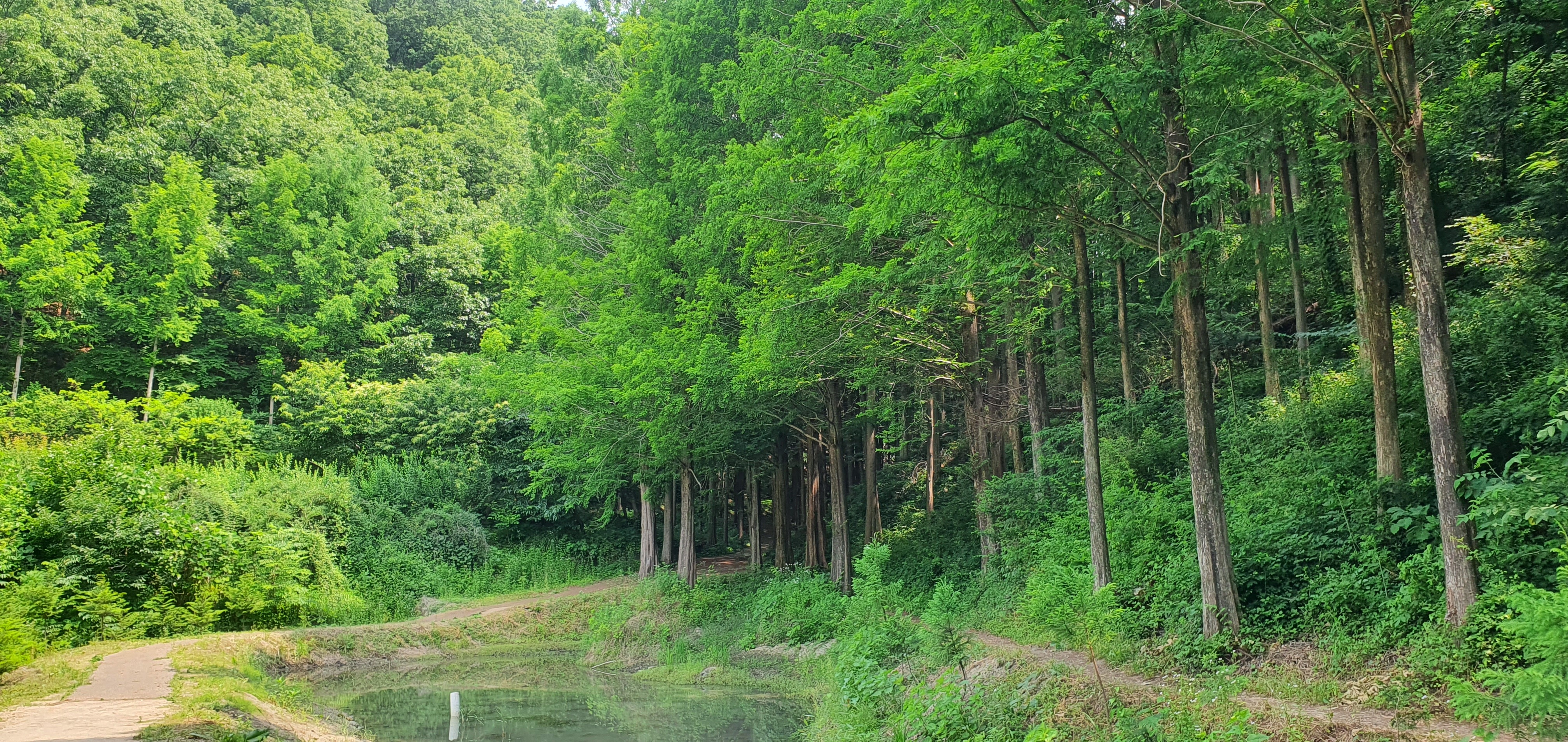 화인산림욕장에서 반완점으로 이동중 메타세콰이어길과 연못 한컷!!!