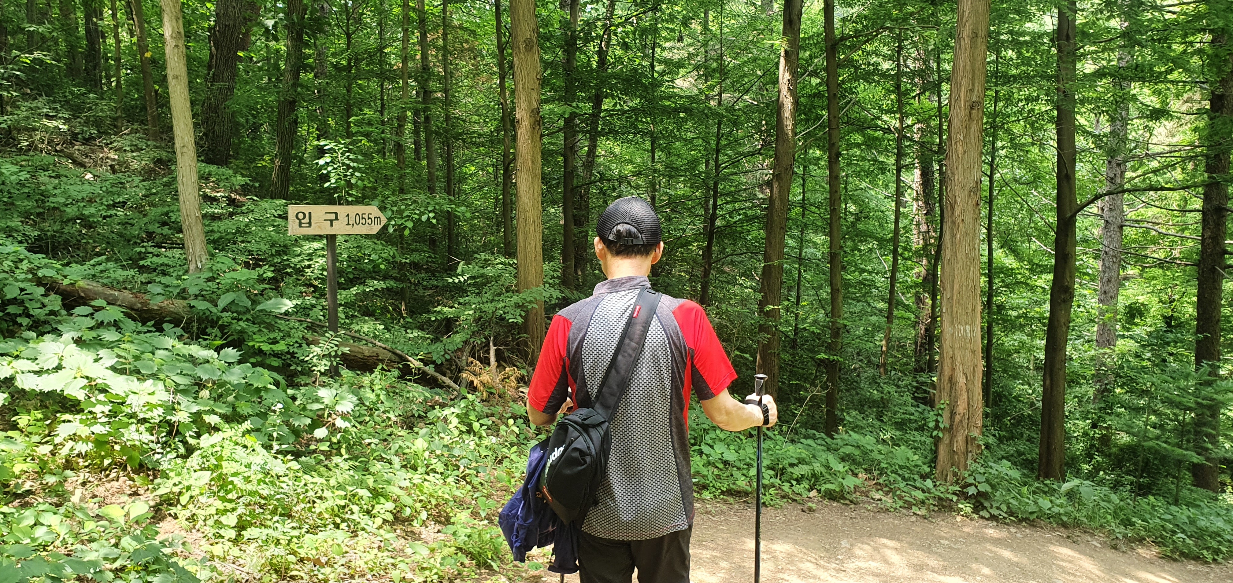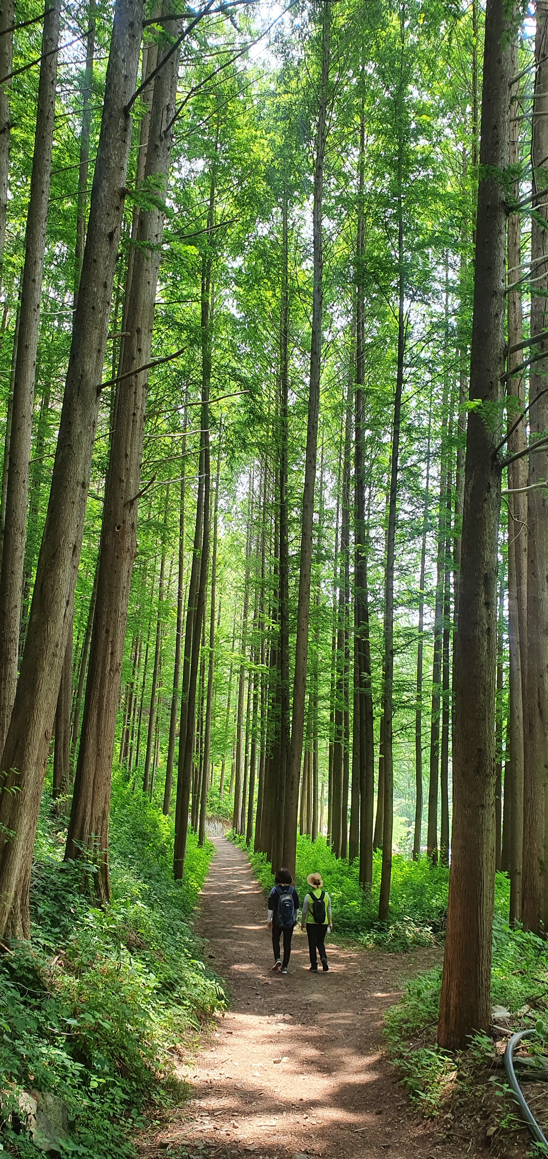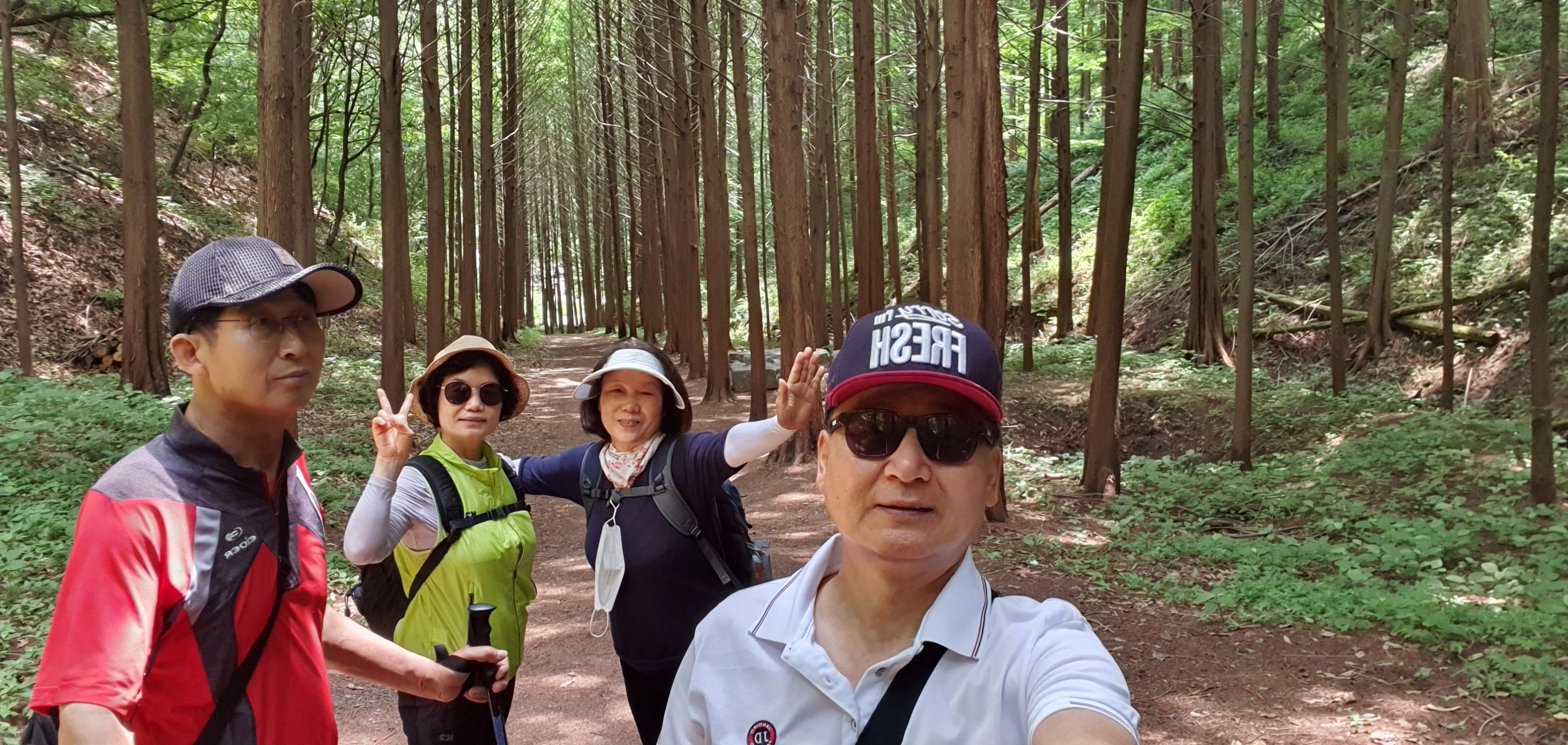 2022년 6월 9일 옥천 화인산림욕장 트레킹 코스 ▶ 정 대표 전원주택과 주차장에서 전원주택 뒤편 연못을 따라 메타세쿼이아 숲으로 진행(상쾌한 숲에서 갑자기 짙은 피톤치드향)↝연못↝메타세쿼이아 숲길↝이정표 오르는 길은 1481m, 내려오는 길은 2525m↝메타스쿼이아길↝산중턱부터 소나무, 참나무길↝반환점(종)↝(U- turn)↜