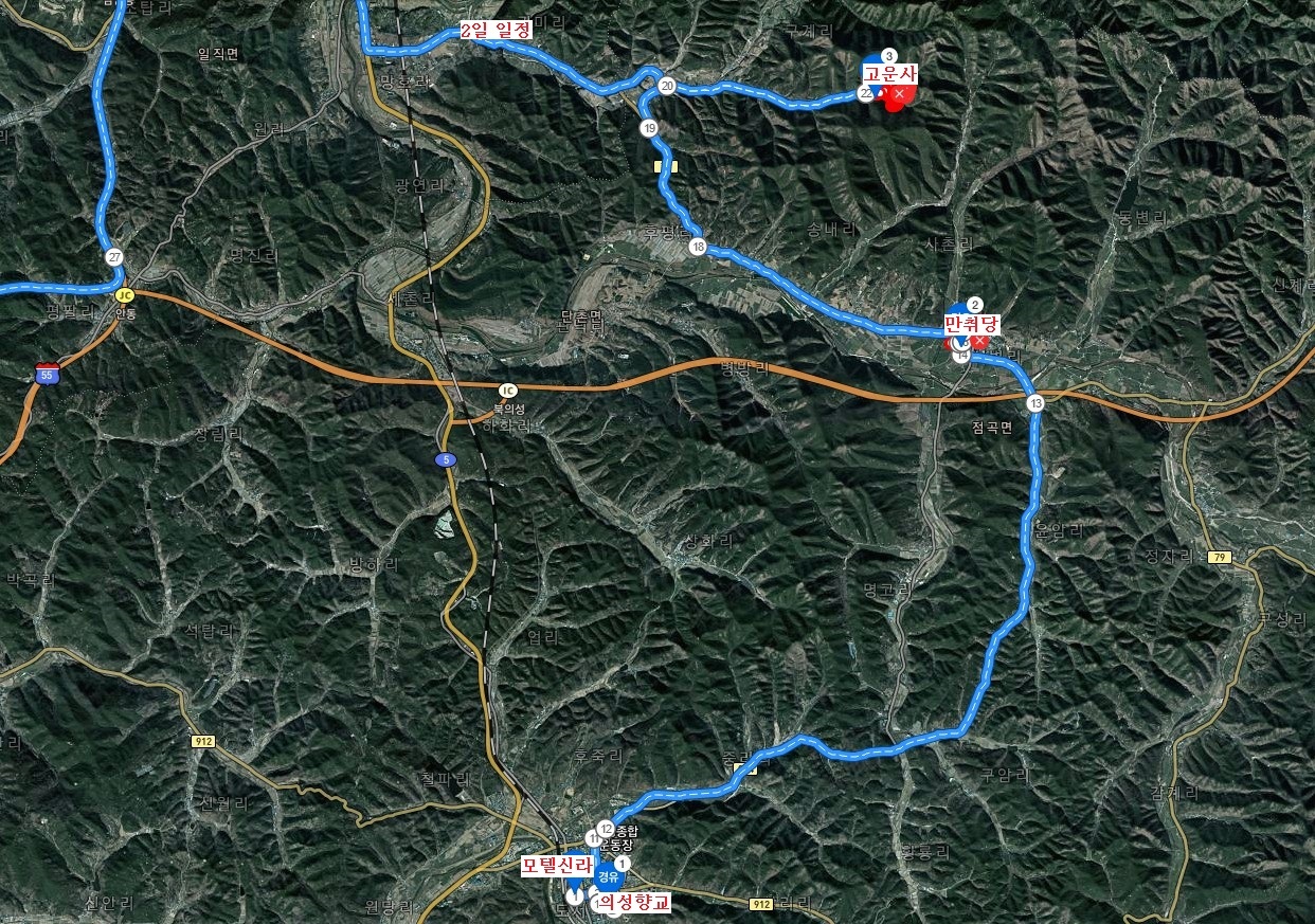 0월 0일(월) 위너스모텔 ↝ 의성향교 주차장 ↝ 의성 만취당 주차장 ↝ 고운사 주차장 ↝ 대전