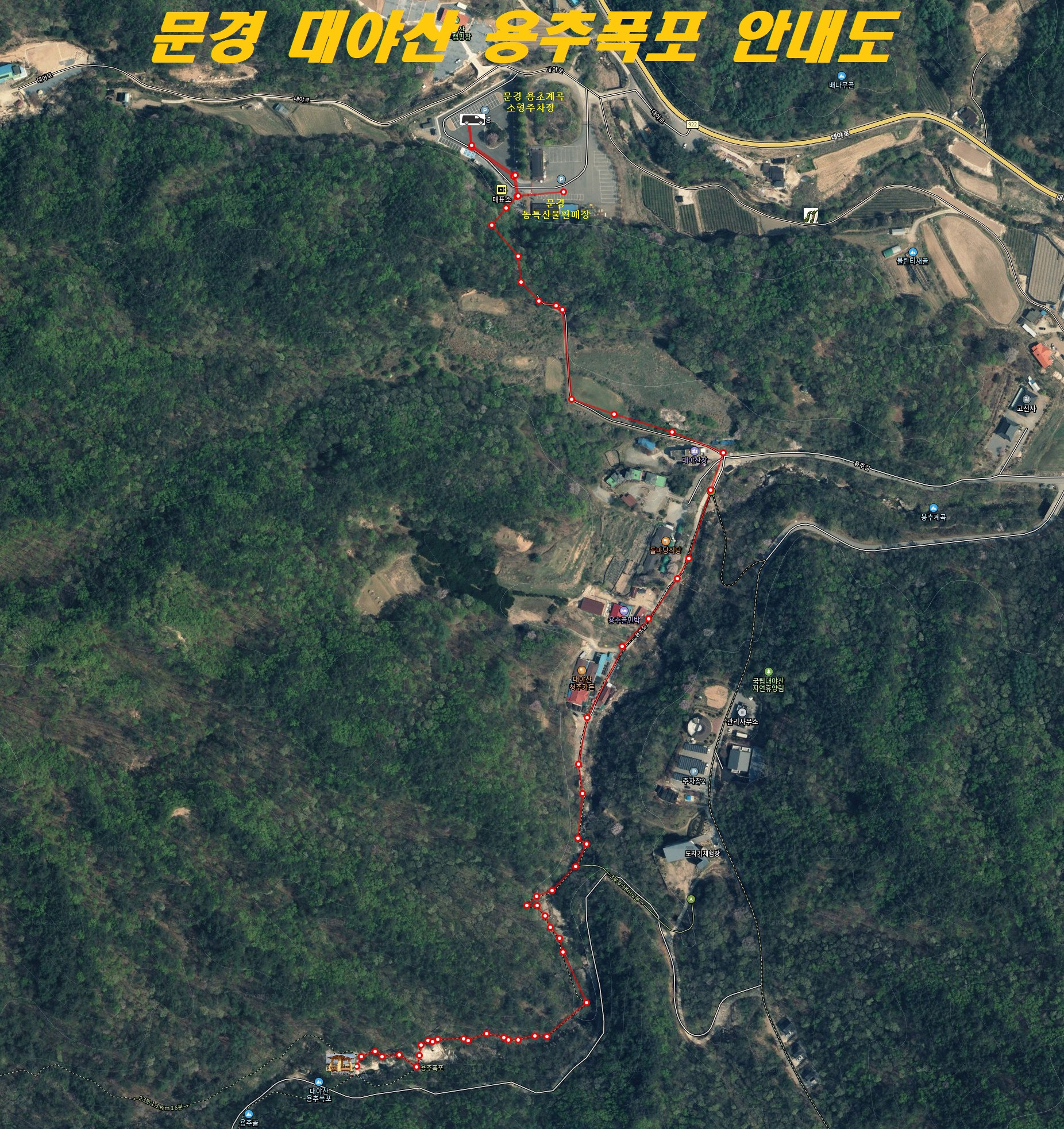 가은모노레일 주차장; 경북 문경시 가은읍 왕능리 416 ↝ 대야산 용추계곡 주차장; 경북 문경시 가은읍 대야로 1306-9