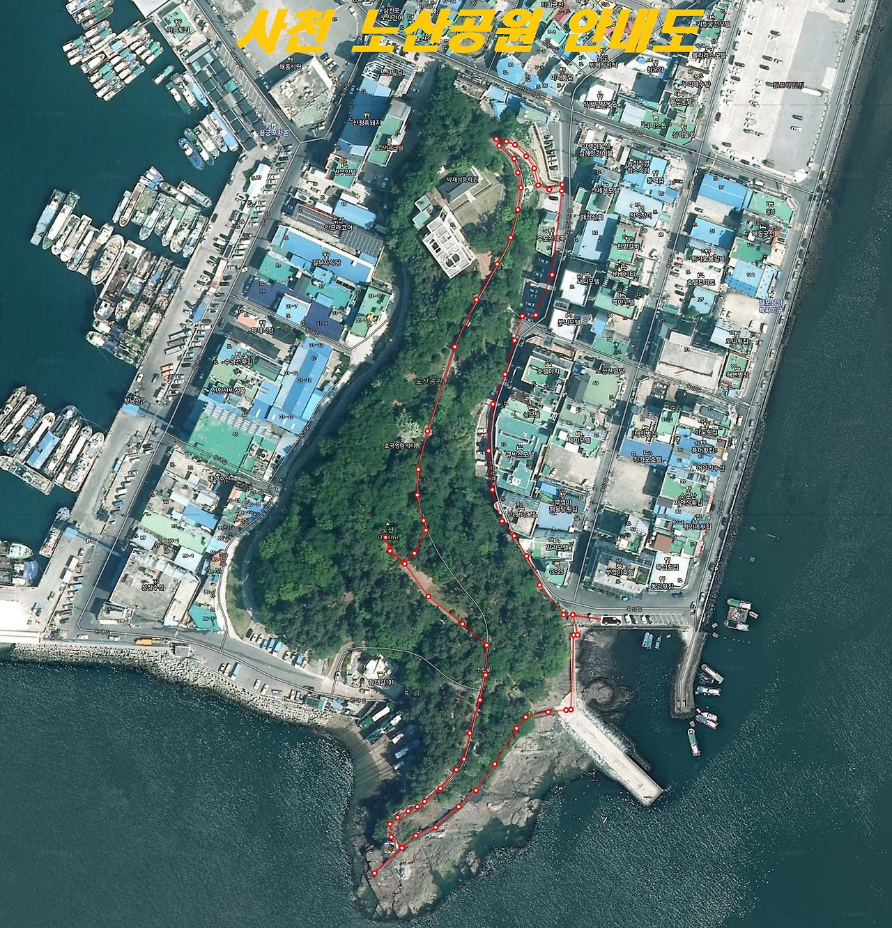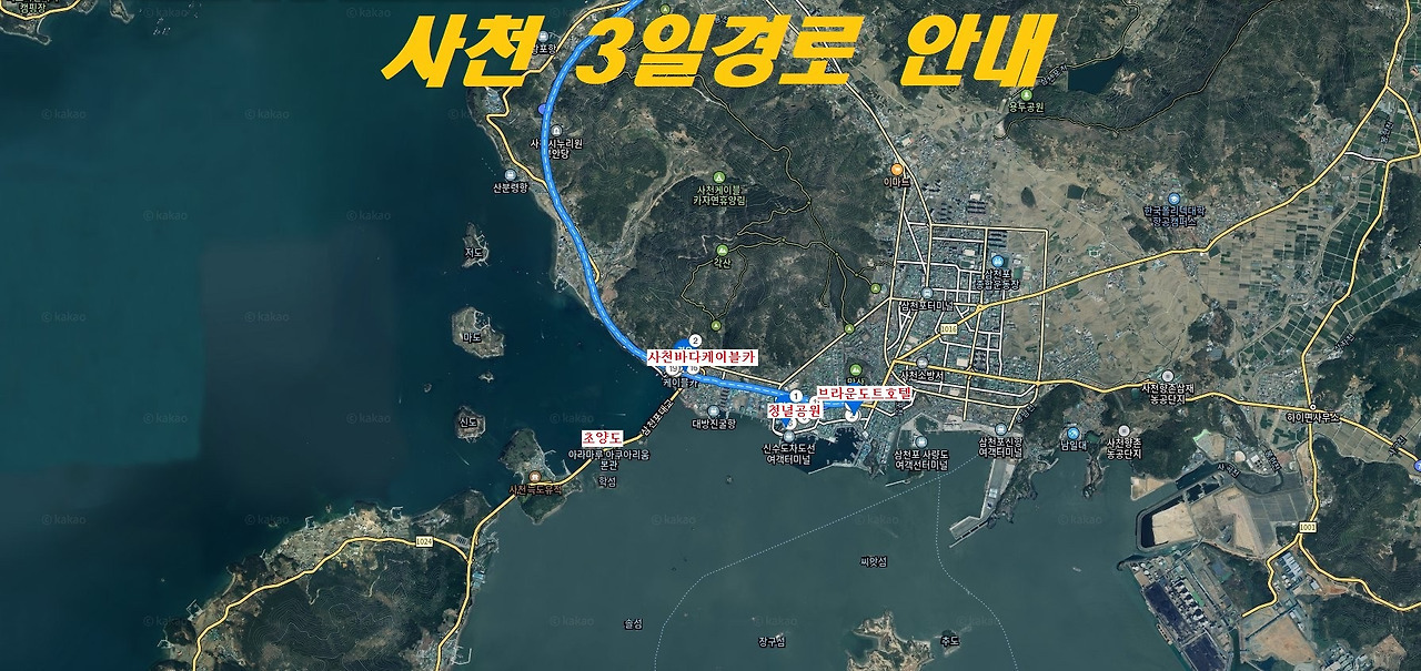 사천바다케이블카 주차장; 경남 사천시 대방동 492 ↝ 사천대방진 굴항 주차장; 경남 사천시 대방동 238