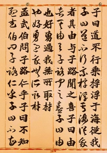 공자가 말씀하시기를 “도가 행해지지 않는구나, 뗏목을 타고 바다를 항해할 것이니 나를 따를 사람은 아마도 유(자로) 일 것이다.” 자로 가 그 말씀을 듣고 기뻐하니 공자가 말씀하기 기를 “유가 용맹을 좋아하는 것은 나보다 나으나 뗏목의 재목(材木)을 취할 곳이 없구나.”