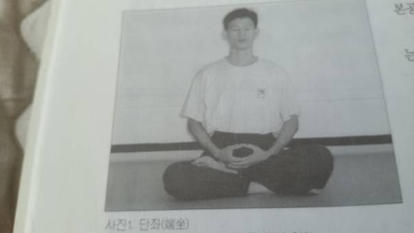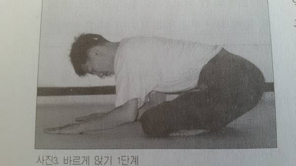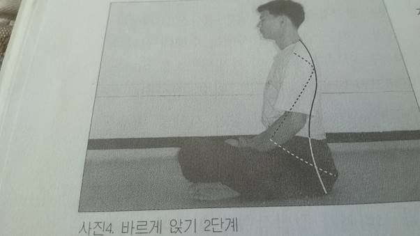 “단아하게 앉는다”는 것은, 밖으로는 허리가 곧고 가슴은 편안하고 머리가 바른 것을 말하고, 안으로는 상·중·하의 세 단전이 제대로 얹혀있는 것을 말한다. 이렇게 단아한 모습을 위해서는 (사진1)의 동작에서 엉덩이를 들어 뒤로 밀어서 꼬리뼈가 들리게 한 다음 허리를 천천히 세워주는 것으로부터 시작한다(사진3, 사진4). 허리를 ‘곧게’(直) 세우기 위해서는 꼬리뼈에서 배꼽으로 무게 중심선이 잡혀야 한다. 이런 상태에서 허리는 태극의 회도리처럼 앞으로 나가게 되고, 그 모습은 활처럼 팽팽하게 당겨져 있는 상태가 되며, 항문은 들려서 뒤쪽으로 45°정도 향하게 된다. 여기서 허리가 뒤로 빠지거나, 항문이 바닥에 닿는다면 정좌나 단좌가 될 수 없다.