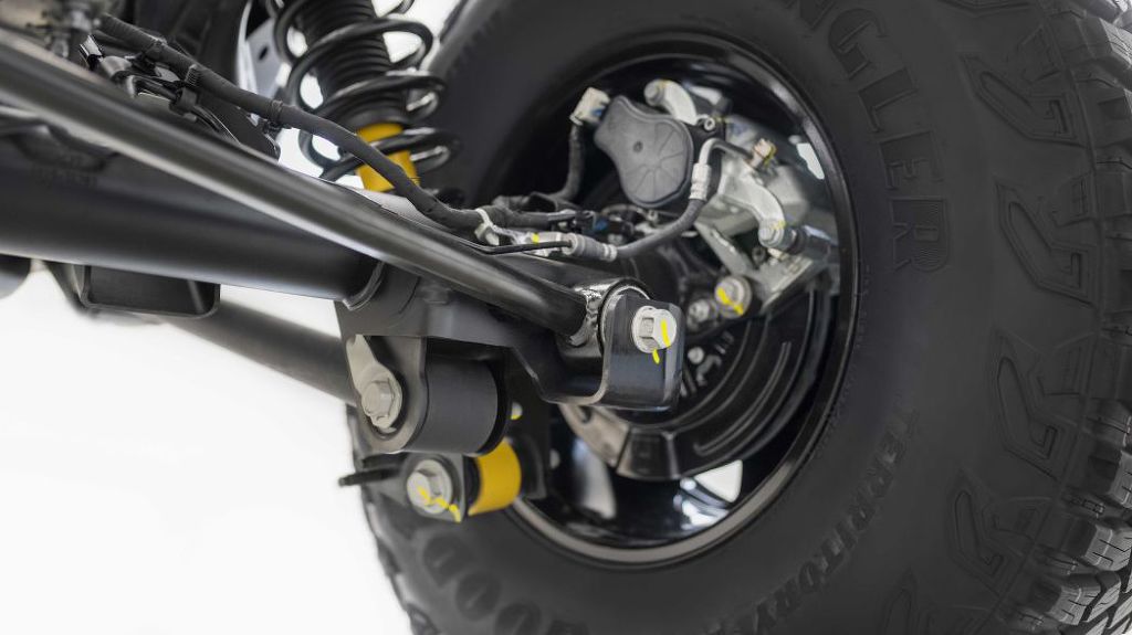 Bronco’s Bilsteins have remote reservoirs that increase oil volume for cooler running, and they also have internal hydraulic end stops that give them position-sensitive damping. They’ll be soft in the middle of their travel and firm up to the ends to soak up big hits with less chance of bottoming or topping out. The end-stop concept is similar to what you’d find on an early TRD Pro Tundra, but that truck’s Bilsteins didn’t have the additional benefit of remote reservoirs.