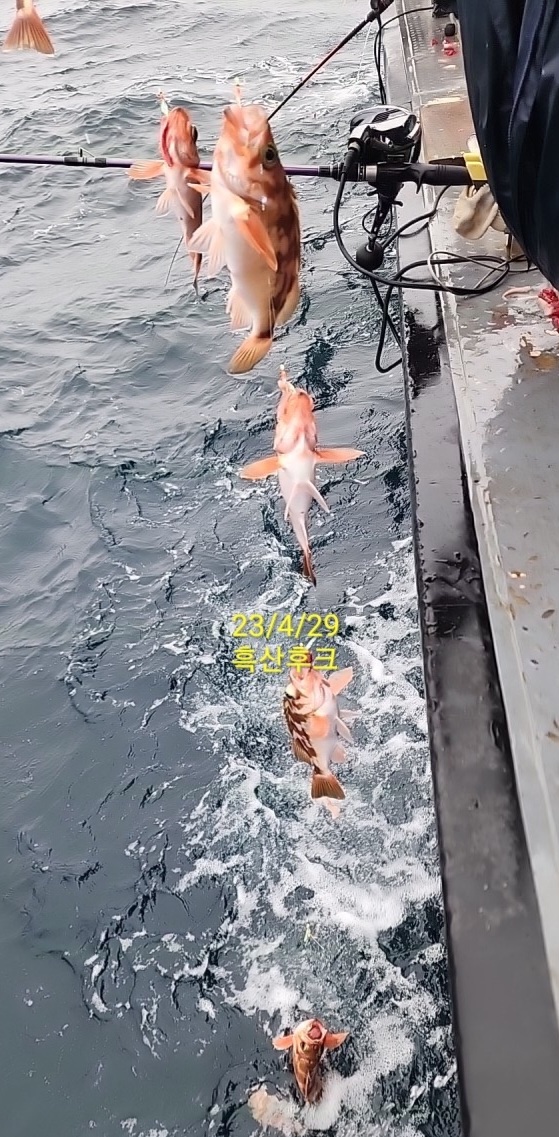 요사이 흑산후크호 연일 초초 대왕열기-신발짝열기-할애비우럭... 주렁주렁~ 사정없이 줄타고 올라 오네요.