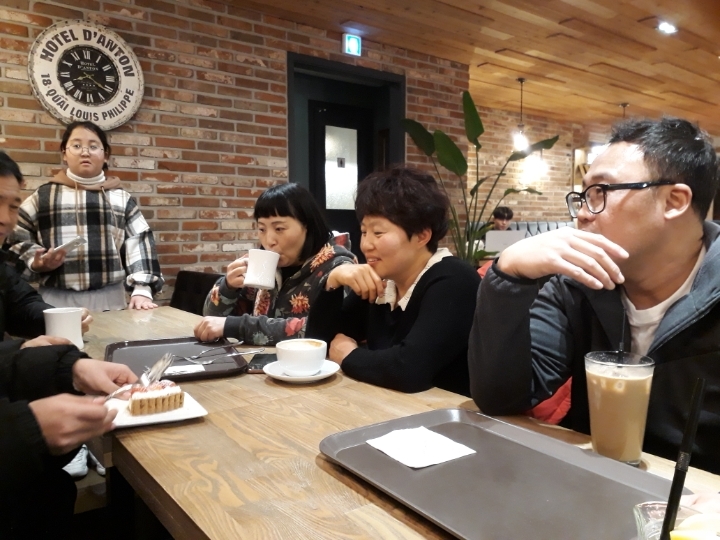 단체손님 자리에 앉았더니 아들이 주문한 차와 케잌이 나와서 먹고 마시며 대화하는 동안 은서 재롱에 입을 다물지 못했다