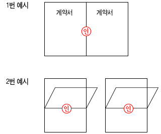 계인:각 문서가 서로 다른 문서로 어떤 관련성을 가지고 있음을 확인하기 위해 찍거나 사인 (여러장을 세워 좌측, 또는 우측 가장자리에 약간씩 포개어 찍거나 사인): 1번 예시