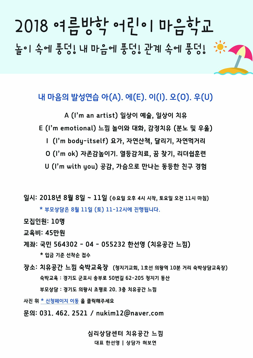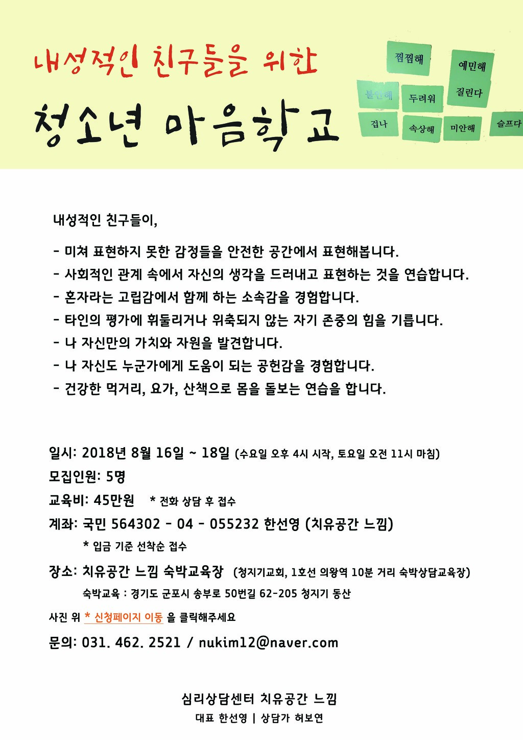 [치유공간 느낌] 2018 여름방학 청소년, 어린이 마음학교 안내 작성자치유공간느낌|작성시간18.06.29|조회수23 목록 댓글 0 글자크기 작게가 글자크기 크게가 자세한 사항은 http://www.nukim.or.kr/c/5/23 를 확인해주세요 ^^신청페이지 이동: http://naver.me/FFkBIaOf 다음검색 현재 게시글 추가 기능 열기 북마크 공유하기 신고 센터로 신고 댓글 댓글 0 댓글쓰기 답글쓰기 댓글 리스트