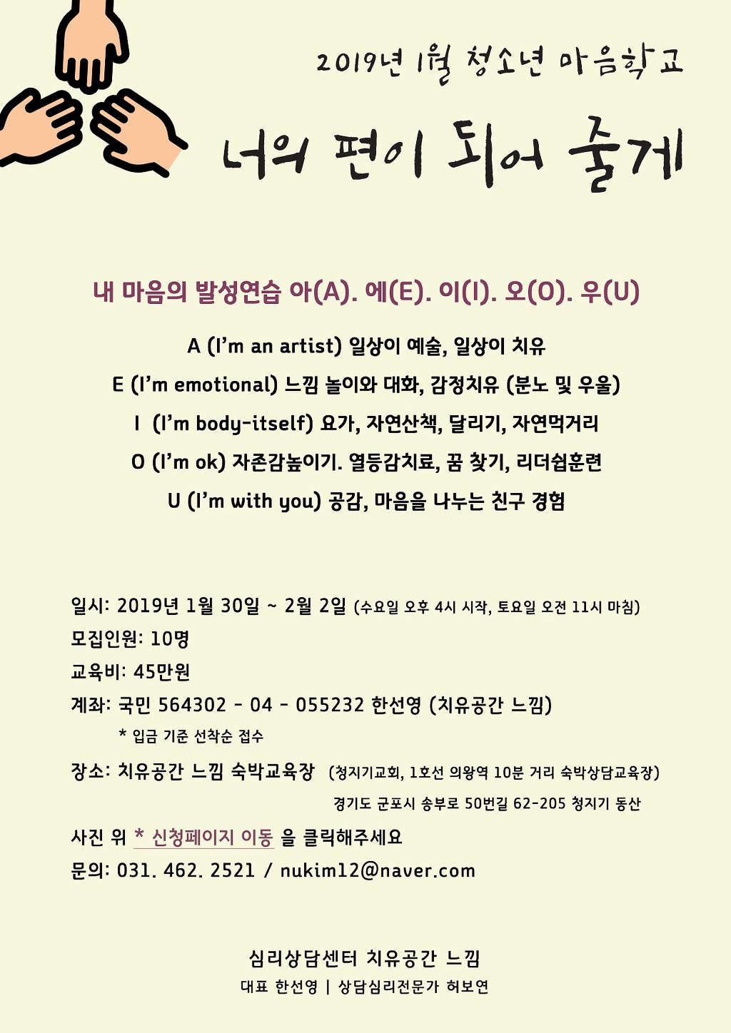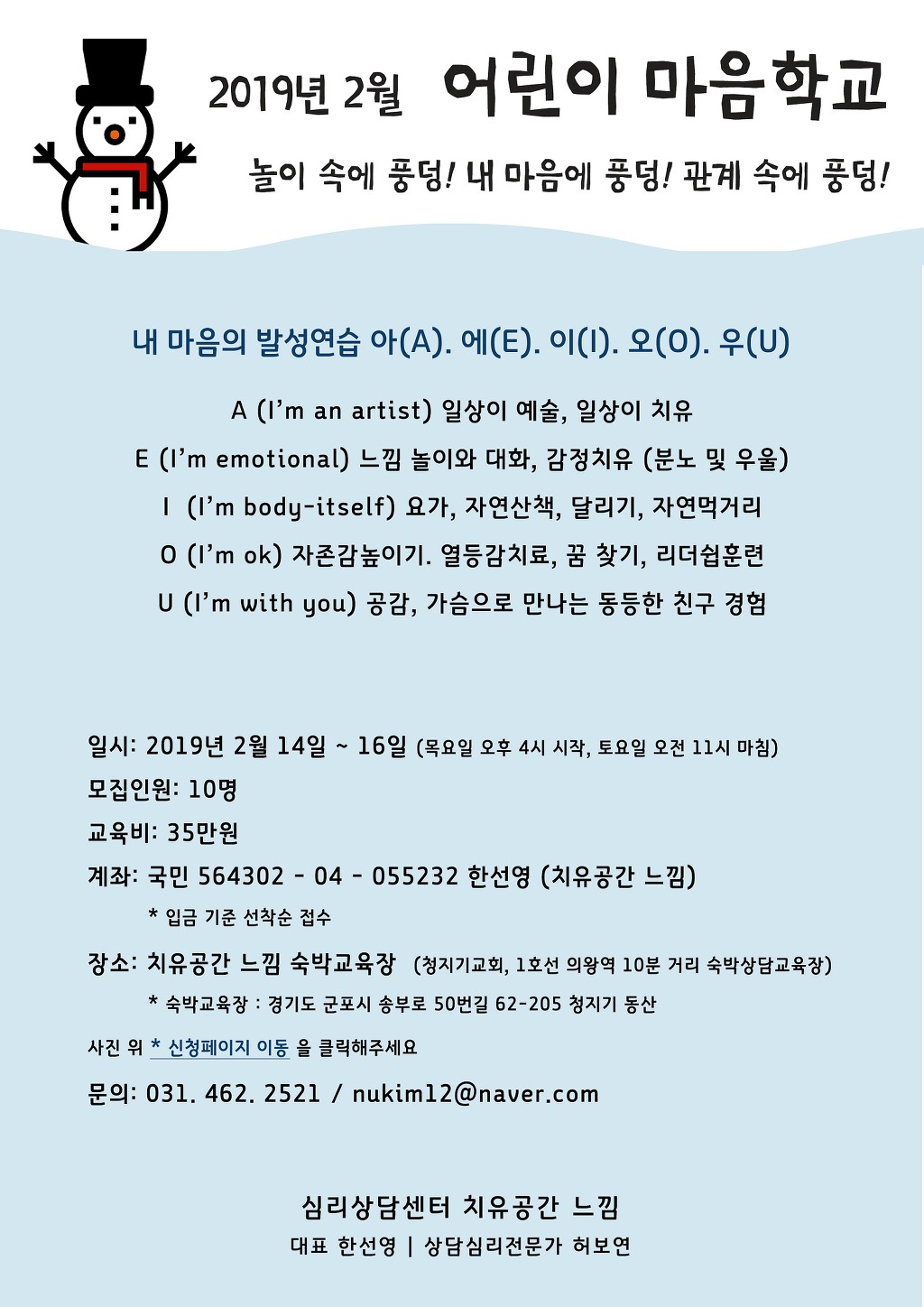 [겨울방학 상담캠프] 청소년/어린이 마음학교 (1,2월 경기도) 작성자치유공간느낌|작성시간19.01.11|조회수27 목록 댓글 0 글자크기 작게가 글자크기 크게가 >>신청페이지 바로가기: http://naver.me/x8Tii4Lj 다음검색 현재 게시글 추가 기능 열기 북마크 공유하기 신고 센터로 신고 댓글 댓글 0 댓글쓰기 답글쓰기 댓글 리스트