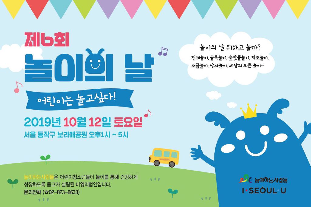 누구나 와서 맘껏 놀 수 있는 제 6회 놀이의 날이 10월 12일 토요일 보라매공원에서 열립니다~ 작성자놀이하는사람들|작성시간19.09.16|조회수30 목록 댓글 0 글자크기 작게가 글자크기 크게가 다음검색 현재 게시글 추가 기능 열기 북마크 공유하기 신고 센터로 신고 댓글 댓글 0 댓글쓰기 답글쓰기 댓글 리스트