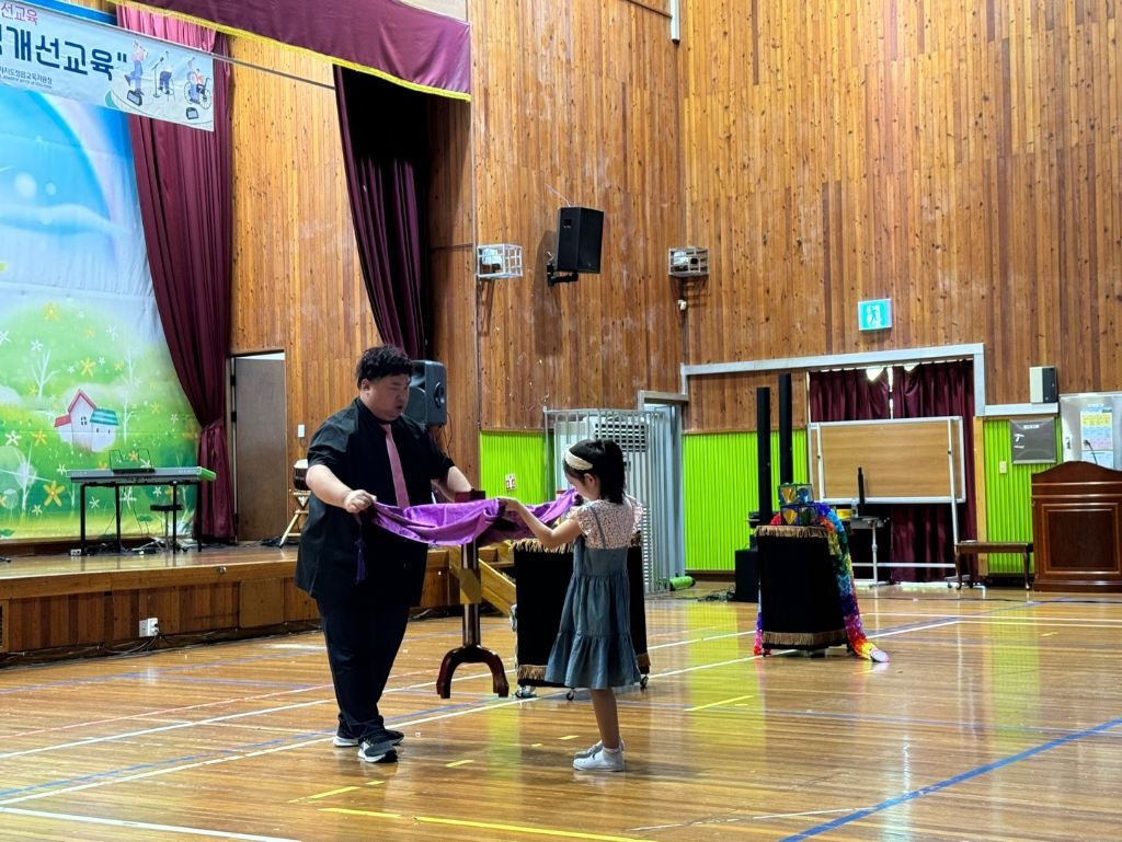 아이들의 눈은 지병호 마술사 손끝을향해 따라다니면서 매순간 순간마다 아이들의 한호성이 울려퍼지는 이곳 수성초등학교 강당 ~!!