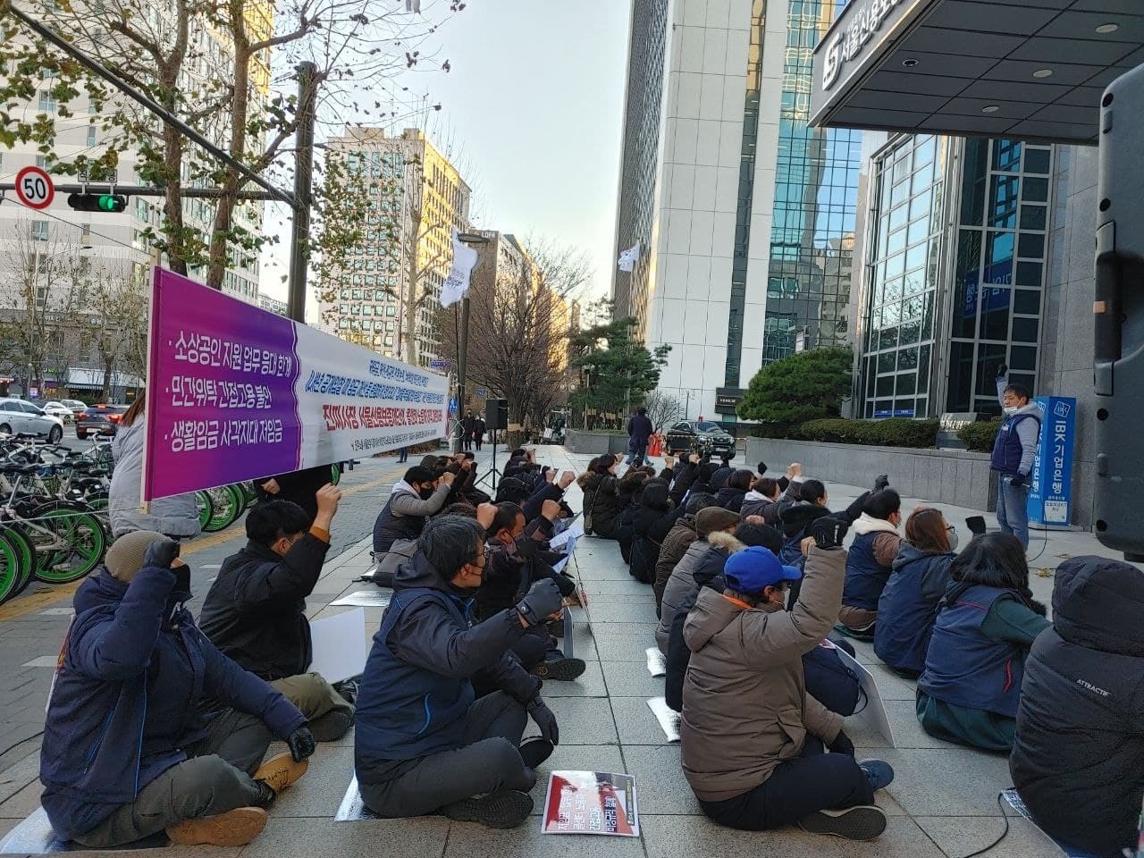 지난 11월 17일 저희 조합원 21명은 시청으로 가 연좌농성 끝에 서울시 노동정책관, 소상공인정책담당관, 재단 관계자,노조대표단과 면담이 이루어질수 있었습니다. 두드리고 두드려야 얼굴비치는 저들입니다.
