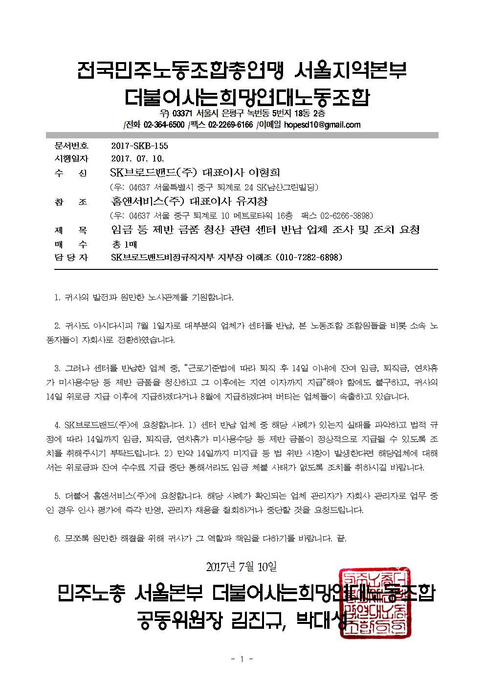 [공문] SKB 및 자회사에 센터 반납 업체 퇴직금 등 금품청산 관련 조사, 조치 촉구한 공문 작성자희망연대노조|작성시간17.07.10|조회수938 목록 댓글 0 글자크기 작게가 글자크기 크게가 20170710센터반납업체금품청산관련.pdf 첨부파일첨부된 파일이 2개 있습니다. jpg 파일 공문_체불임금지급촉구001.jpg 다운로드 pdf 파일 20170710센터반납업체금품청산관련.pdf 다운로드 다음검색 현재 게시글 추가 기능 열기 북마크 공유하기 신고 센터로 신고 댓글 댓글 0 댓글쓰기 답글쓰기 댓글 리스트