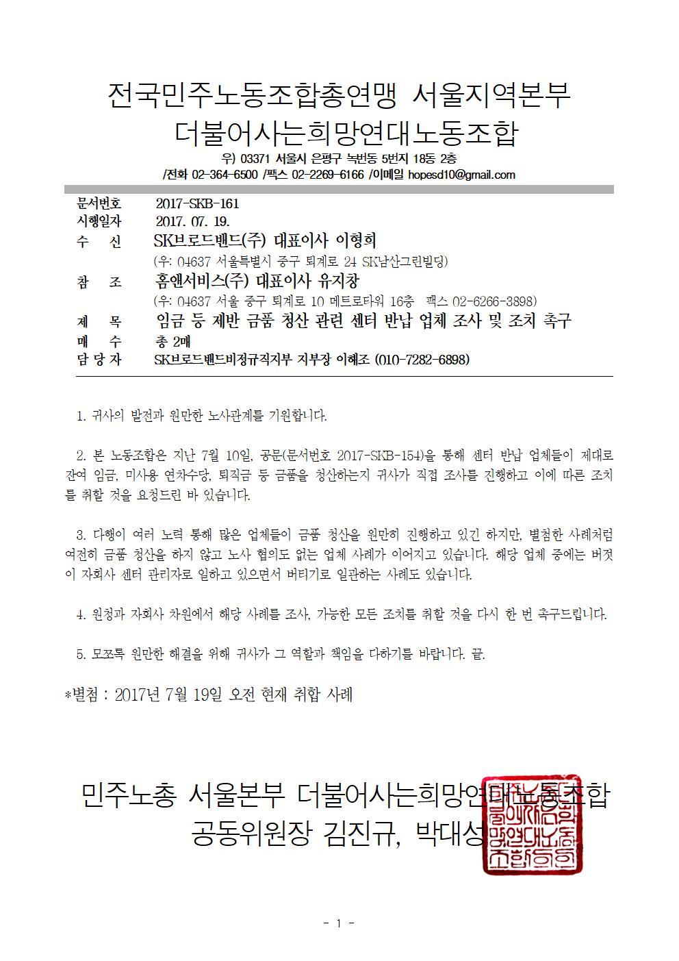2. 본 노동조합은 지난 7월 10일, 공문(문서번호 2017-SKB-154)을 통해 센터 반납 업체들이 제대로 잔여 임금, 미사용 연차수당, 퇴직금 등 금품을 청산하는지 귀사가 직접 조사를 진행하고 이에 따른 조치를 취할 것을 요청드린 바 있습니다.