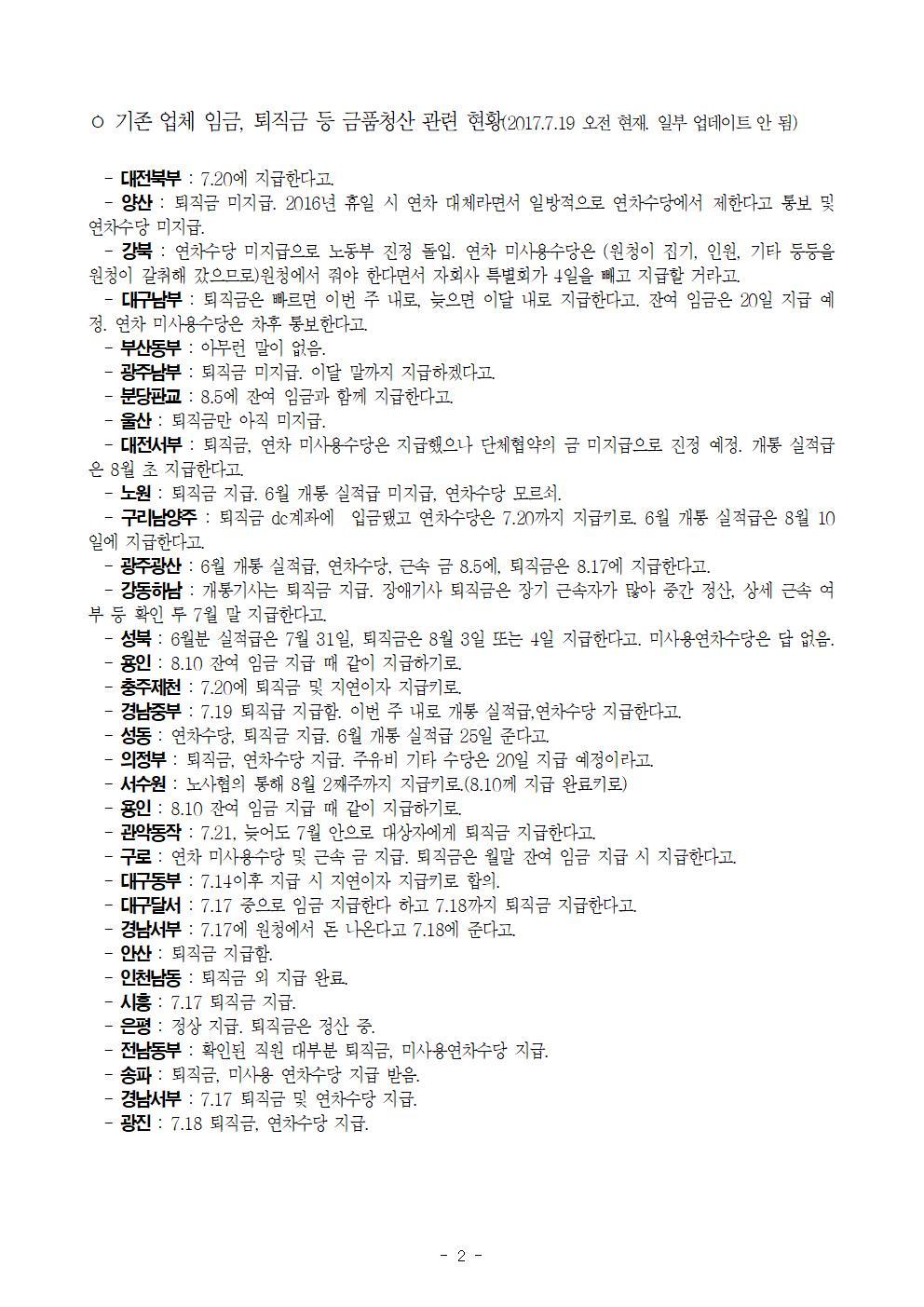 - 대구달서 : 7.17 중으로 임금 지급한다 하고 7.18까지 퇴직금 지급한다고.