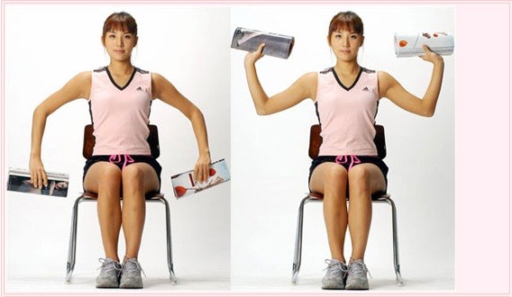 의자에 앉아서 양손에 잡지나 책을 각각 쥐 세요.