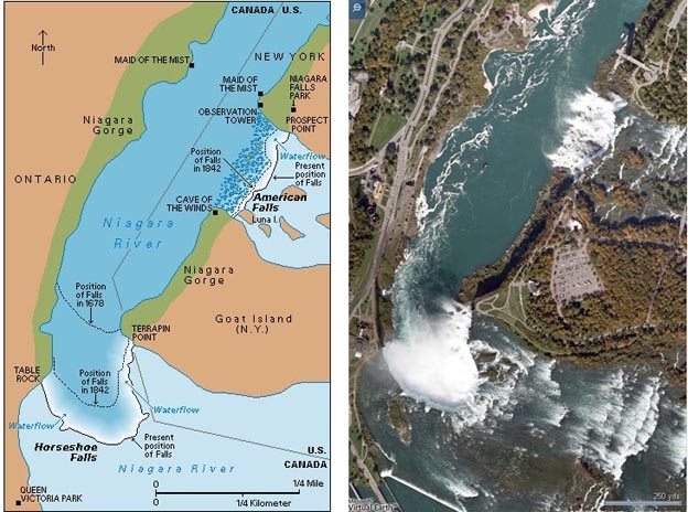 미국과 캐나다 국경에 있는 거대한 폭포. 오대호(湖) 중 온타리오호와 이리호를 잇는 나이아가라강에 있으며, 강 가운데에 있는 고트섬(미국령)을 경계로 캐나다폭포(높이 48m, 나비 900m)와 미국폭포(높이 51m, 나비 305m)로 나뉜다. 케스타 지형이며 상층보다 무른 하층의 지층이 먼저 침식되어 폭포 안쪽이 크게 패여 있다. 상류쪽 물의 일부는 수력발전용으로 회류(回流)되고 있으므로 폭포의 침식량이 줄어들어, 보다 오랜 기간 폭포의 형체를 유지할 수 있게 되었다. 연간 200만 명 이상의 관광객이 방문하고 있으며, 캐나다와 미국에서는 나이아가라 폭포를 보호하기 위해 관광철 폭포의 수량을 매초 2830t, 다른 시기에는 그 반으로 제한하고 있다. 폭포 양쪽에는 나이아가라폴스라는 같은 이름의 도시가 두 나라에 있는데 관광 도시로 유명하다.