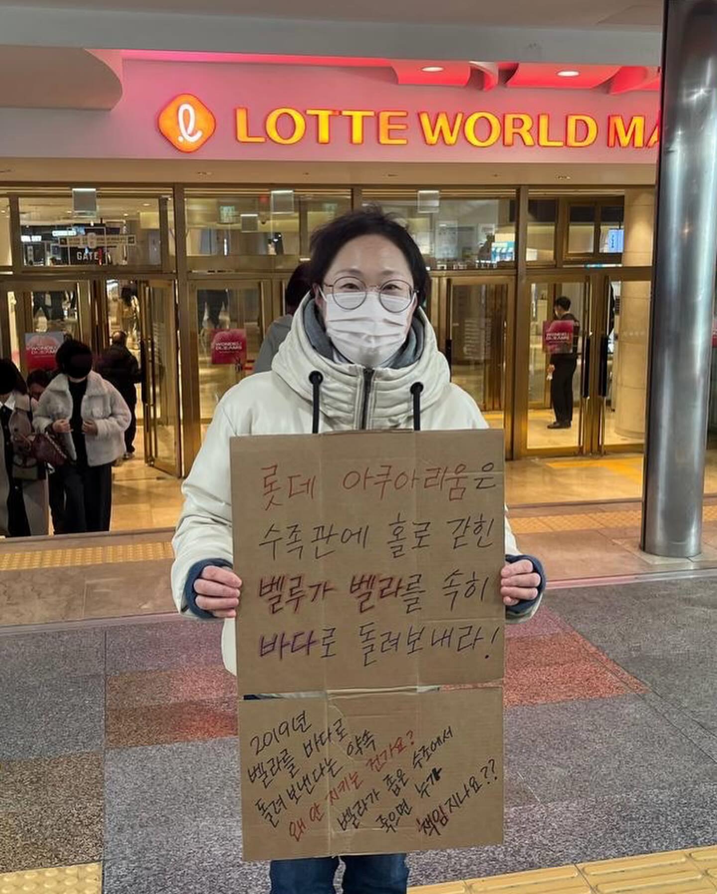 70대 정도되신 어르신 한 분이 다가오셔서 부산에서 해양관련 기관장을 지내셨다면서 10분 정도 해양 오염의 문제점에 대해 의견을 주셨어요. 바다 쓰레기 문제가 심각하다면서 시위를 하는 이유에 대해서도 질문하셨습니다. 어르신께 롯데 아쿠아리움은 2019년 10월 벨루가 ’벨라‘를 방류한다는 약속을 했지만 2024년이 되도록 약속을 지키지 않고 있고 벨라는 당장 바다로 돌아가지 못한다면 좁은 수조 속에 갇혀 죽을 지도 모른다는 심각성을 전했습니다.