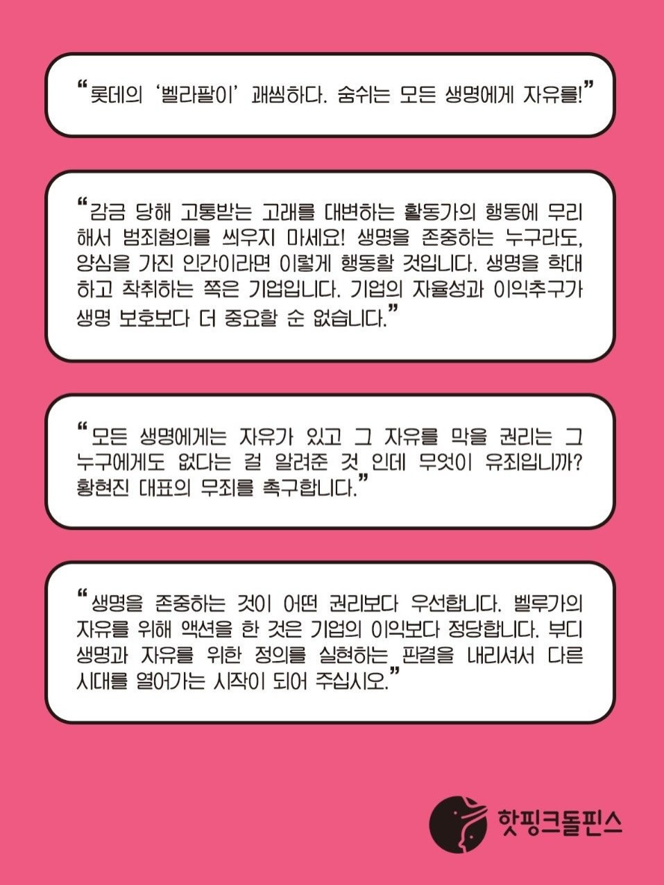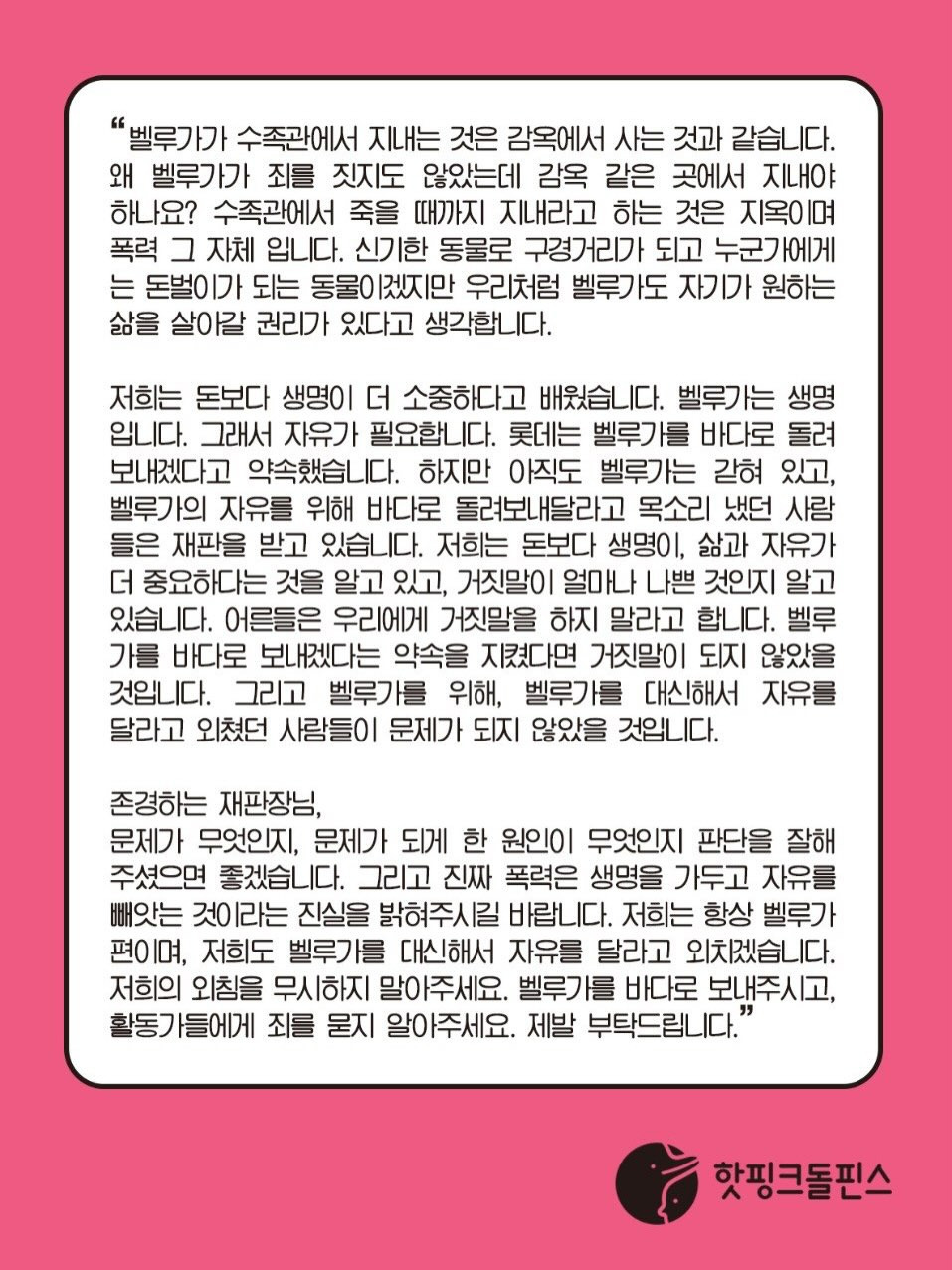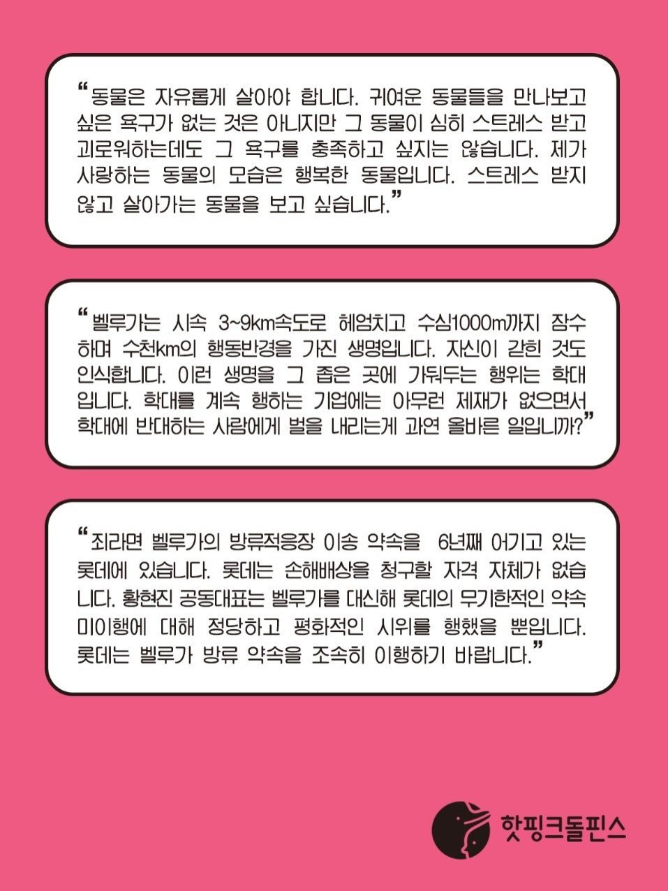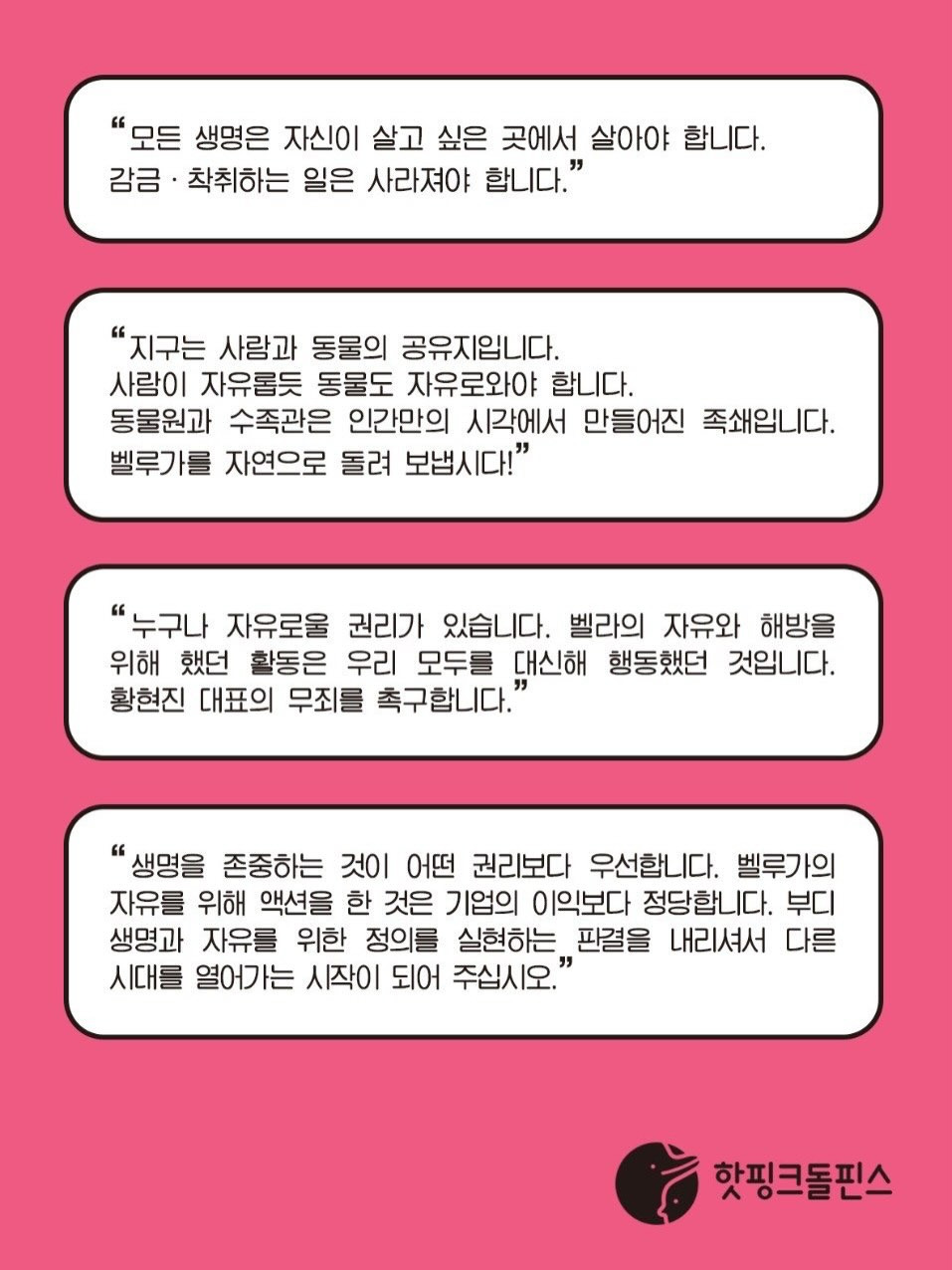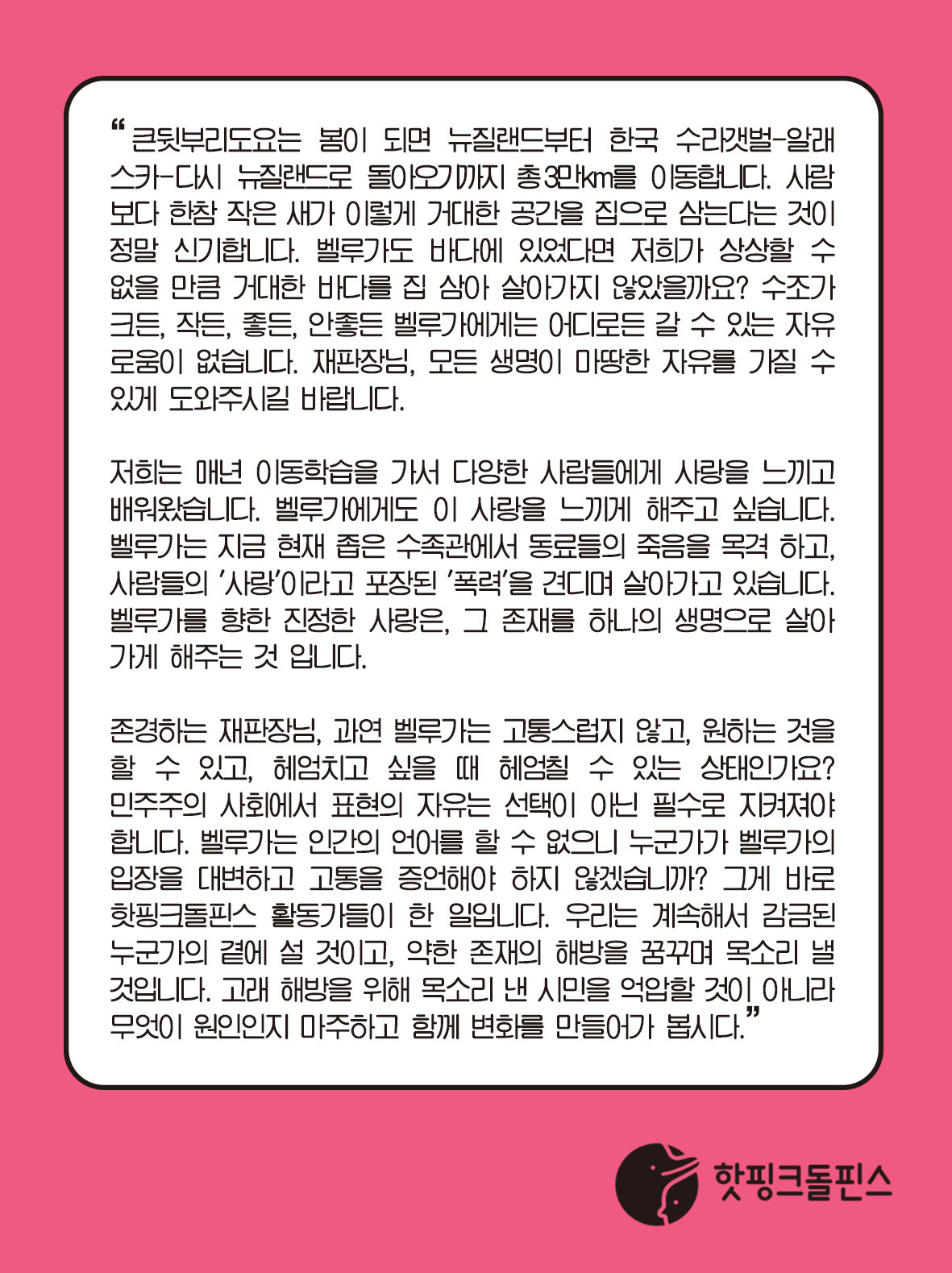 롯데월드 아쿠아리움 벨루가 해방 촉구 행동 무죄 탄원서명에 1천명이 넘는 시민들이 참여해주었습니다. 여러분의 소중한 탄원서는 항소심 재판부에 제출됩니다. 정성 가득한 자필 탄원서를 작성해준 성미산학교 학생&교사분들과 온라인 서명 참여로 핫핑크돌핀스 황현진 공동대표의 무죄를 촉구해준 모든 분들께 감사드립니다.🐬🙏🌿