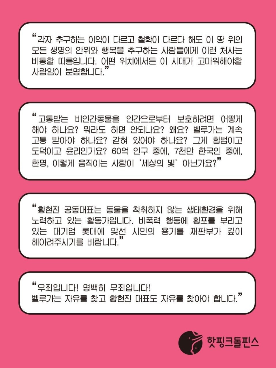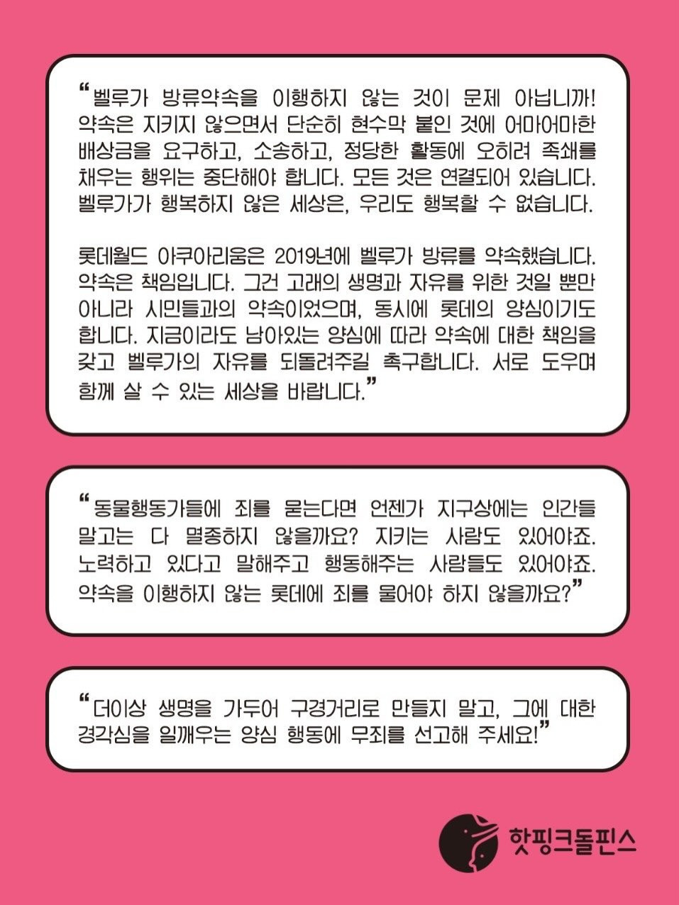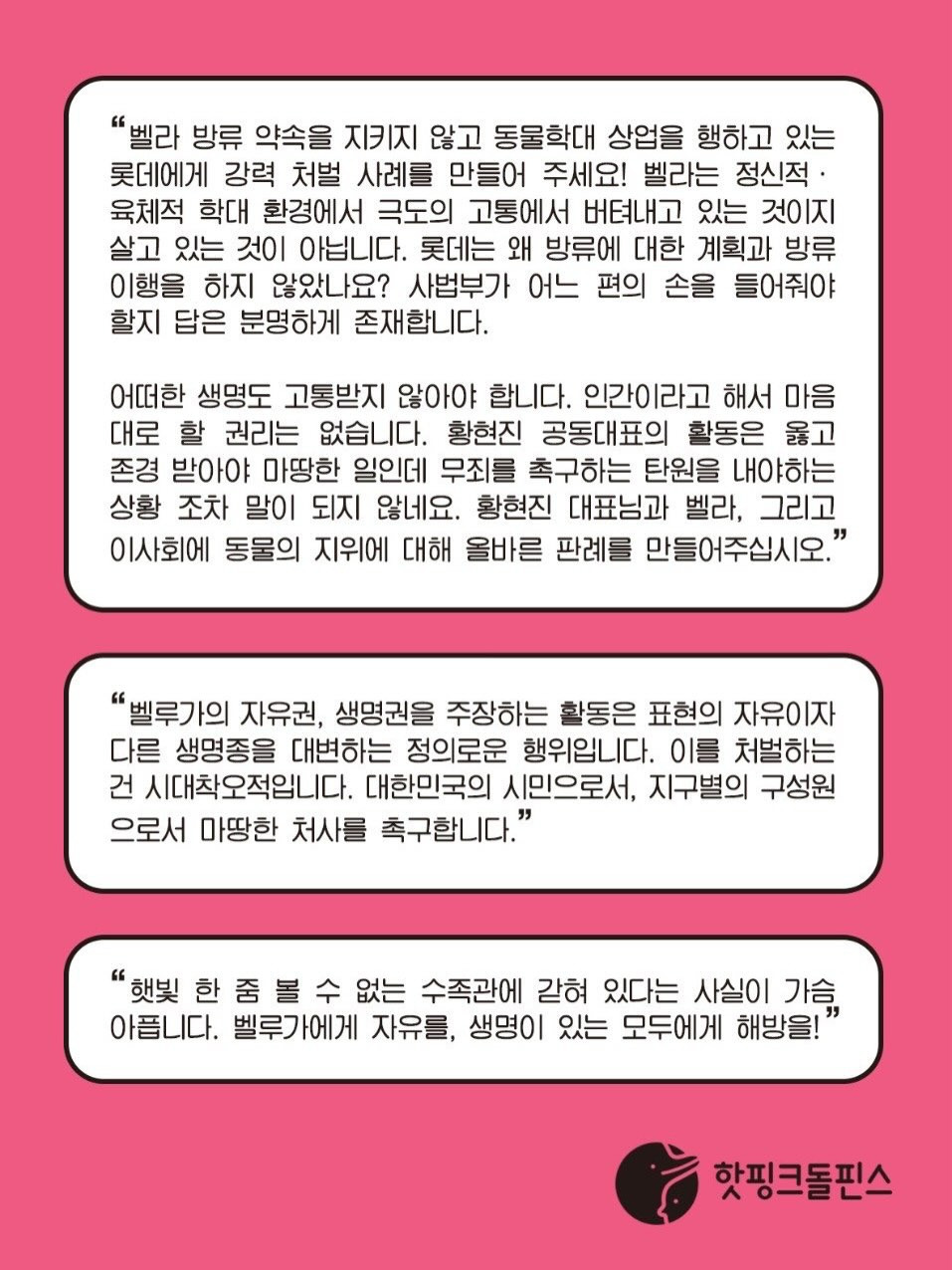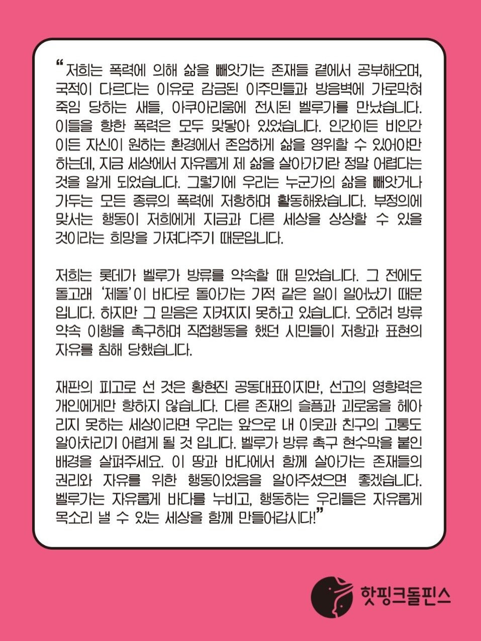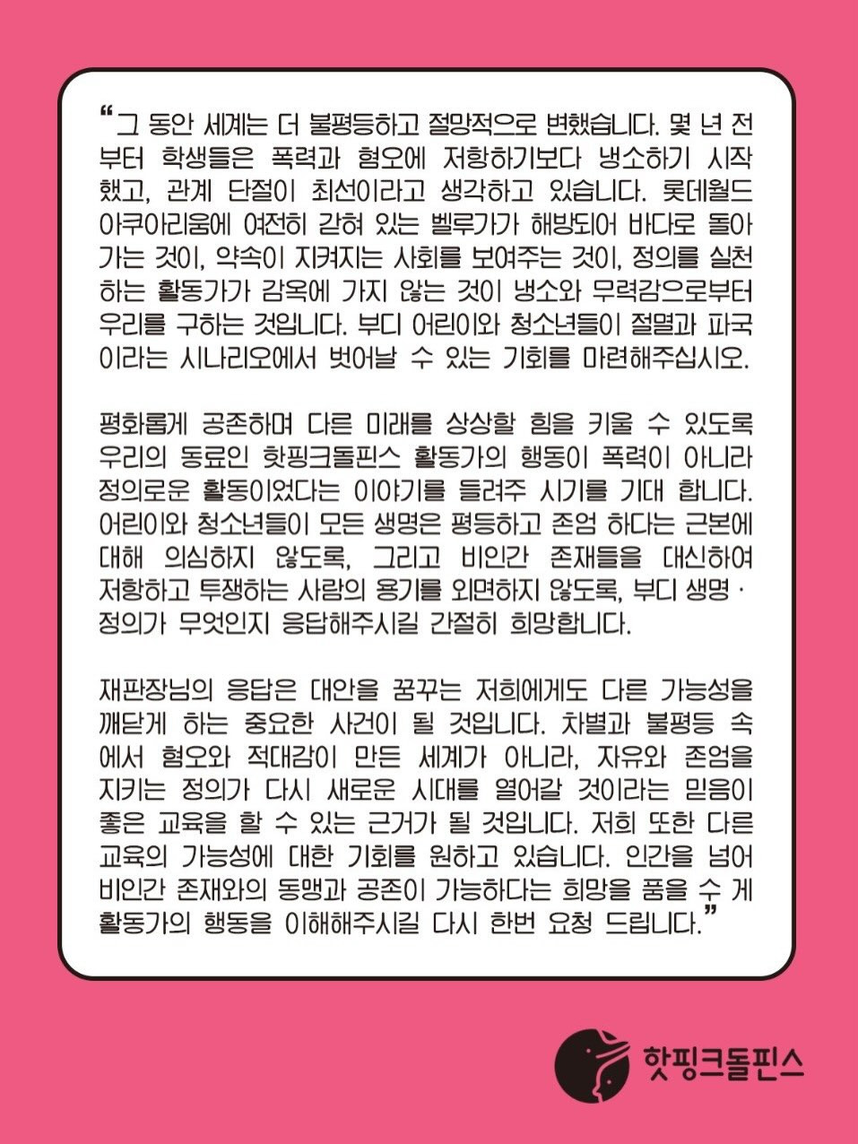 롯데월드 아쿠아리움 벨루가 해방 촉구 행동 무죄 탄원서명에 1천명이 넘는 시민들이 참여해주었습니다. 여러분의 소중한 탄원서는 항소심 재판부에 제출됩니다. 정성 가득한 자필 탄원서를 작성해준 성미산학교 학생&교사분들과 온라인 서명 참여로 핫핑크돌핀스 황현진 공동대표의 무죄를 촉구해준 모든 분들께 감사드립니다.🐬🙏🌿