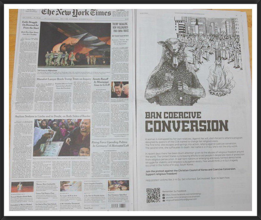 미국 뉴욕타임즈에 '강제개종금지' 광고가 실려 눈길을 끌고 있습니다.