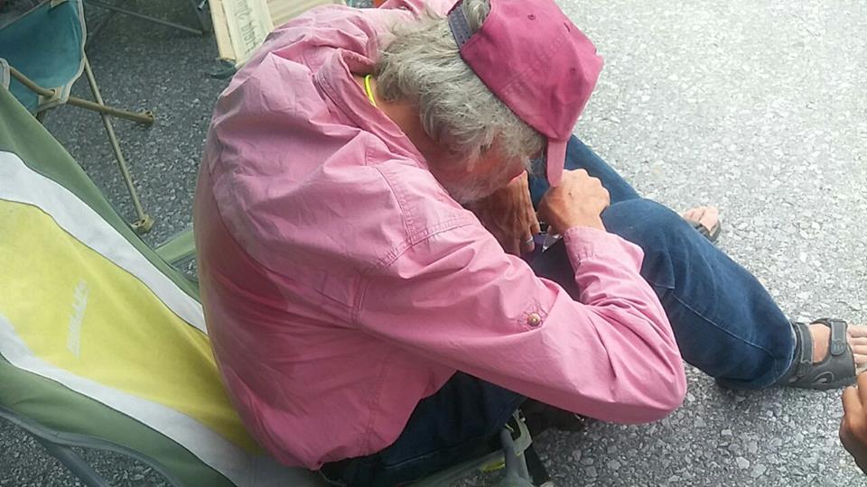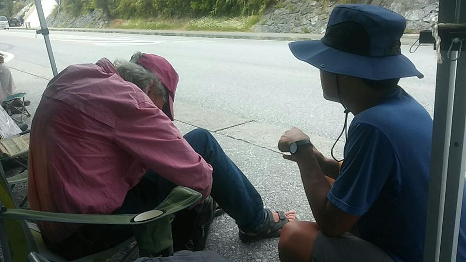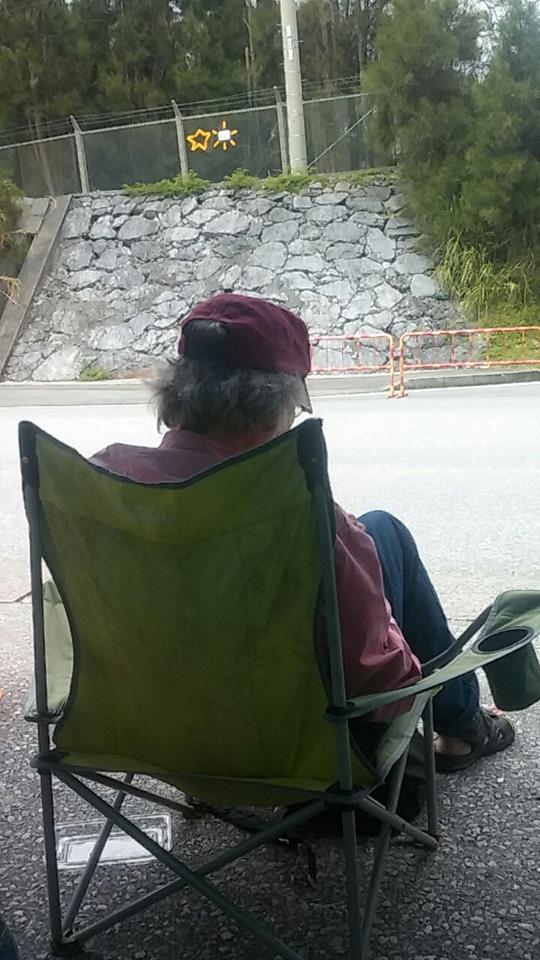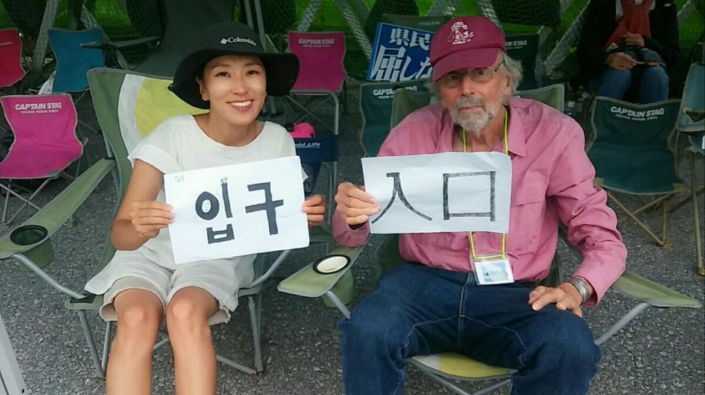 전날과 같이 또 연대발언과 노래/율동(바위처럼^^;;)을 하고 한켠에 앉아 있었습니다. 오전 11시 즈음 연좌 천막앞에 버스 한 대가 서더니 나고시에서 연대방문 온 사람들이 우두둑 쏟아져 나왔습니다. 수십 명의 일본인 사이에 캡을 눌러 쓴 왜소한 서양인 할아버지 한분이 스쳐지나갔습니다. 순간 '앗!'하는 감(?)이 왔고 저의 예감은 맞았습니다. 그 할아버지는 바로 '더글러스 러미스(C. Douglas Lummis)'선생님이었습니다.