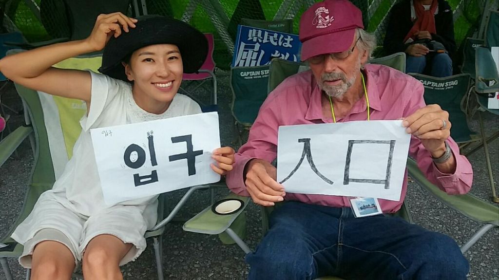 핫핑크돌핀스의 활동에 대해 설명드리고 9월 20일부터 열리는 '제2회 평화의 바다 국제 캠프'에 대해서도 말씀드렸습니다. 더글러스 러미스 선생님도 쫑알쫑알쫑알 떠들어 대는 젊은 이들이 마음에 드셨는지 이름과 연락처도 물어보시고 가방에서 주섬주섬 인쇄물들을 꺼내 선물(?)로 주셨습니다. 그리고 급기야 연좌 천막 건너편 철조망 펜스에 '입구'라고 적힌 종이를 붙여달라는 미션까지 하사하셨다는...^^ 더글러스 러미스 선생님과의 반가운 만남을 끝내고 바닷가쪽의 해상투쟁 천막으로 이동해 그곳에 계신분들께 응원의 메시지를 전하고 전시된 사진과 투쟁기록들을 살펴보고 돌아왔습니다.
