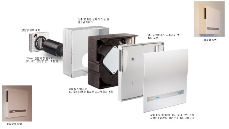 미세먼지와 라돈을 걸러주는 필터, 발음 및 단열이 된 급기 팬과 열 교환 소자가 있는 본체
