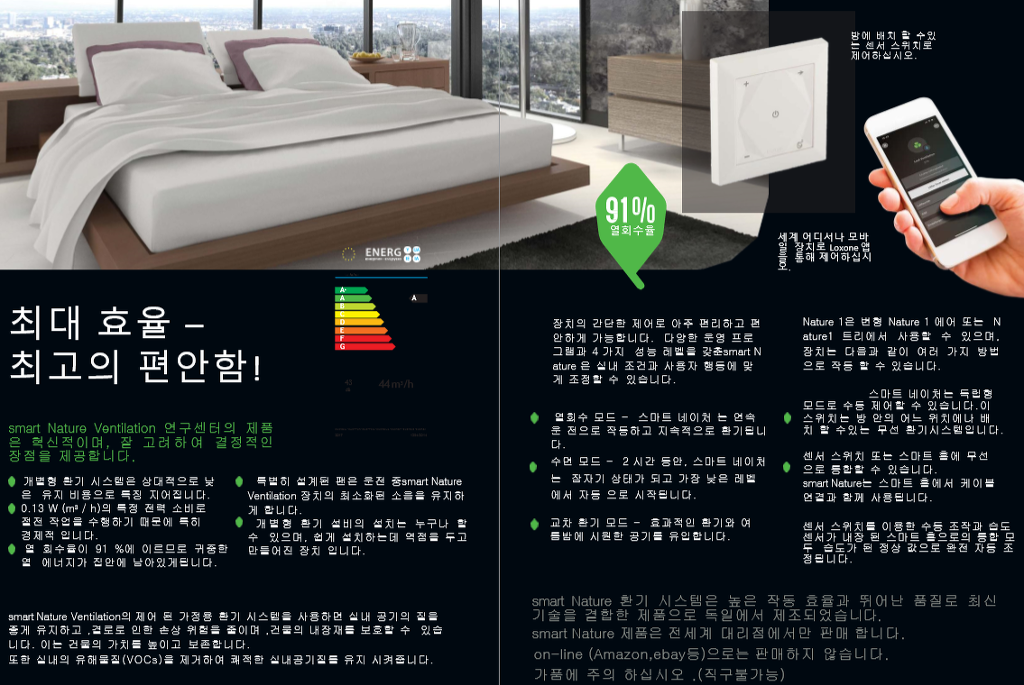 스마트 네이쳐 전열교환기는 0.13w로 아주 경제적입니다. 그리고 스마트 네이쳐 전열교환기 내부에 세라믹으로 된 열 교환 소자가 두 개나 존재하여 열 회수율이 91%에 도달하는 에너지 효율이 높은 전열교환기 입니다.