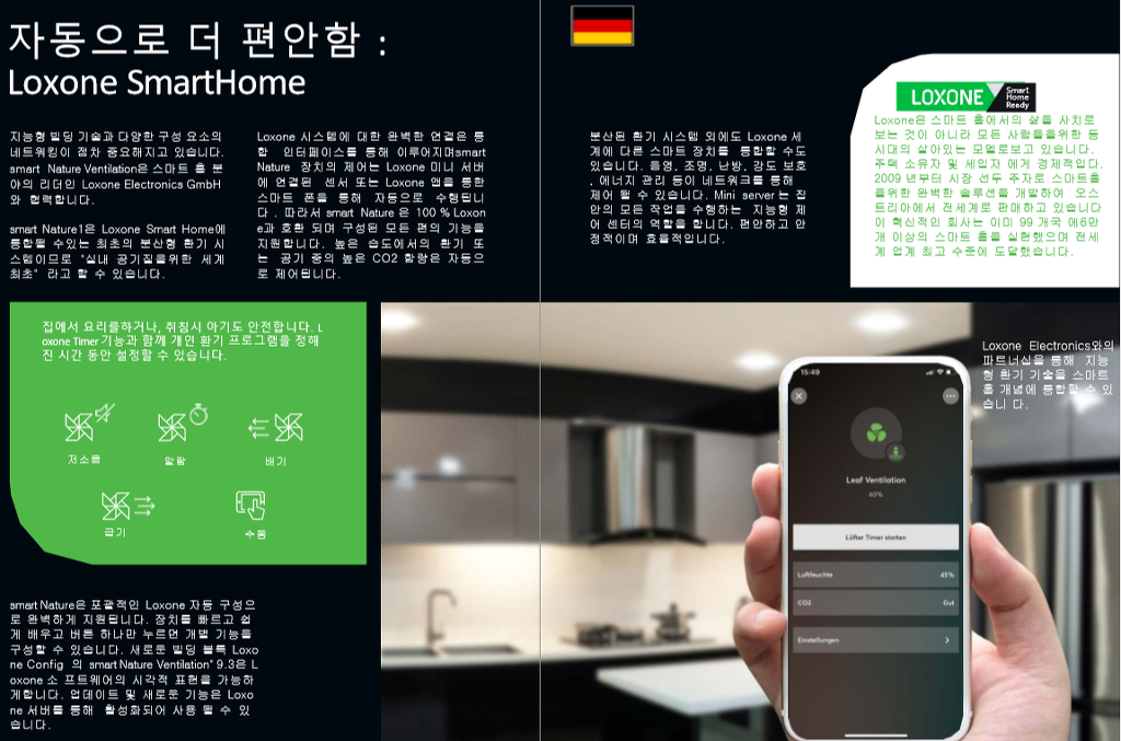 그리고 "LOXONE" 스마트 폰 어플을 이용하여 열회수 모드와 수면 모드, 교차 환기 모드 등을 모두 조절이 가능하여 아주 지능적이고 현대 사회에서 편리한 스마트 네이쳐 전열교환기 입니다.