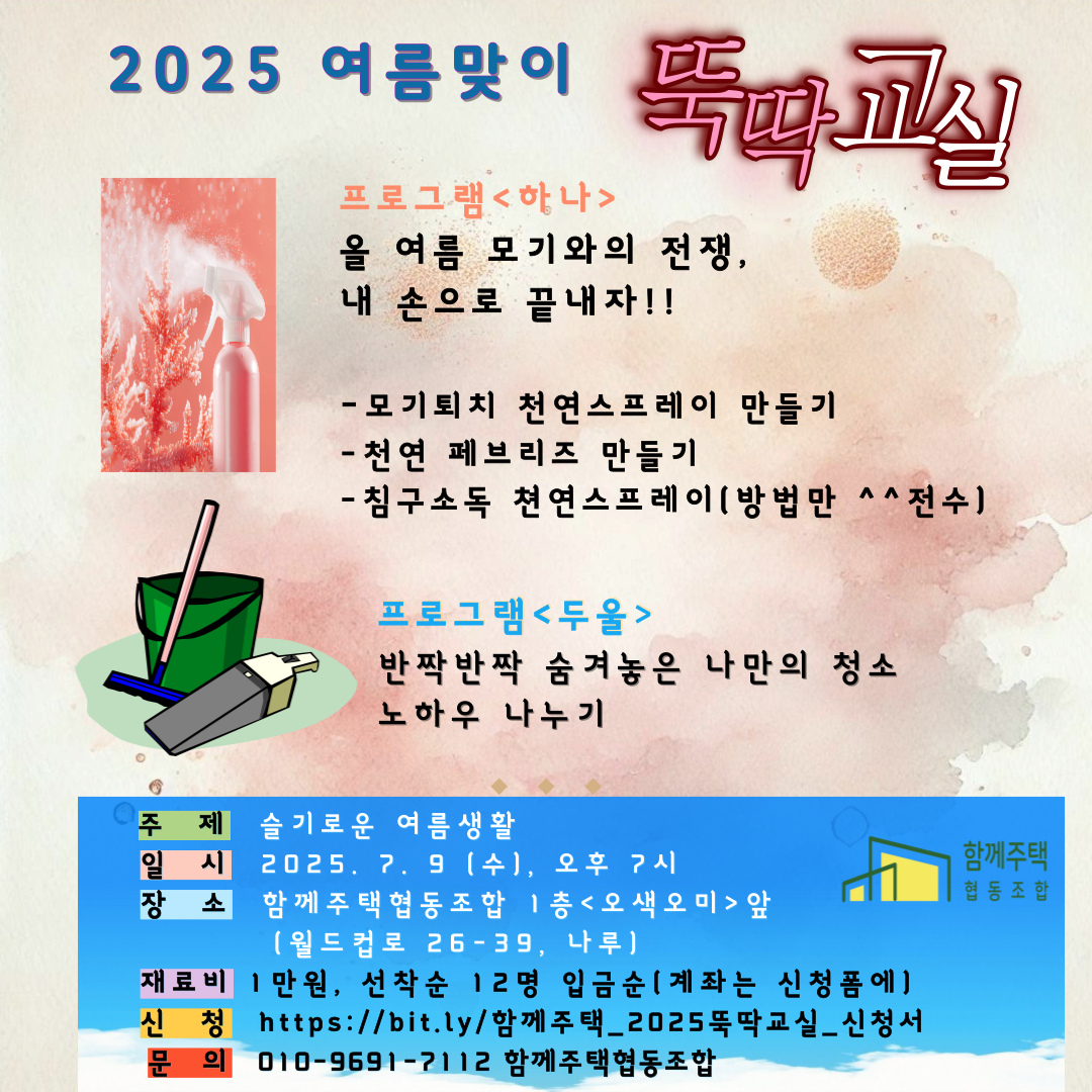2025년 여름맞이 뚝딱교실 작성자함께주택협동조합|작성시간25.07.28|조회수15 목록 댓글 0 글자크기 작게가 글자크기 크게가 다음검색 현재 게시글 추가 기능 열기 북마크 공유하기 신고 센터로 신고 댓글 댓글 0 댓글쓰기 답글쓰기 댓글 리스트