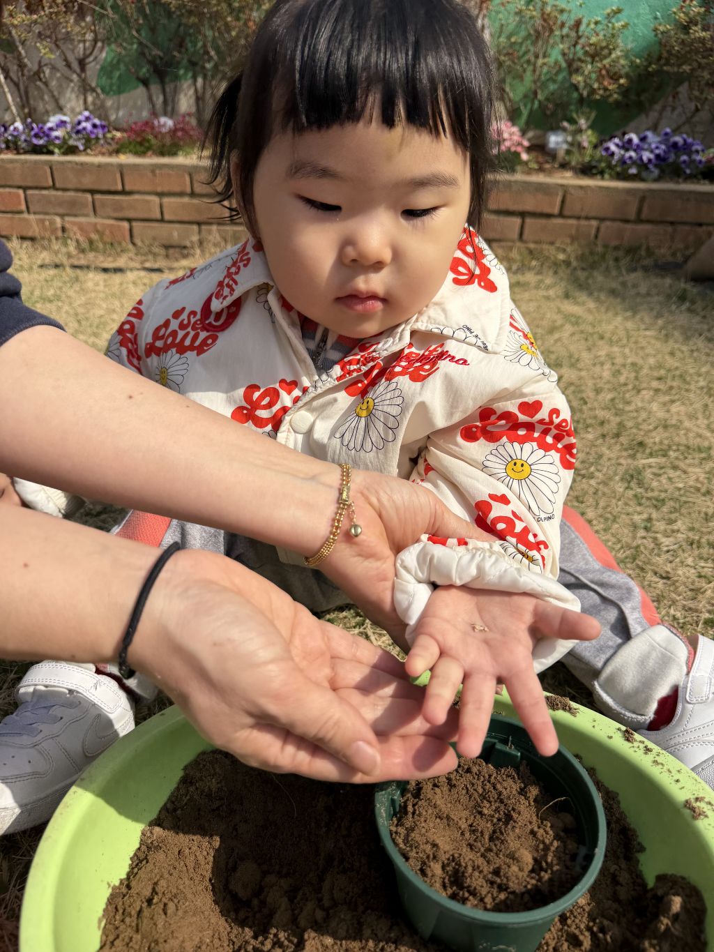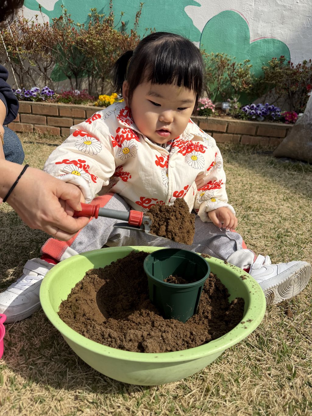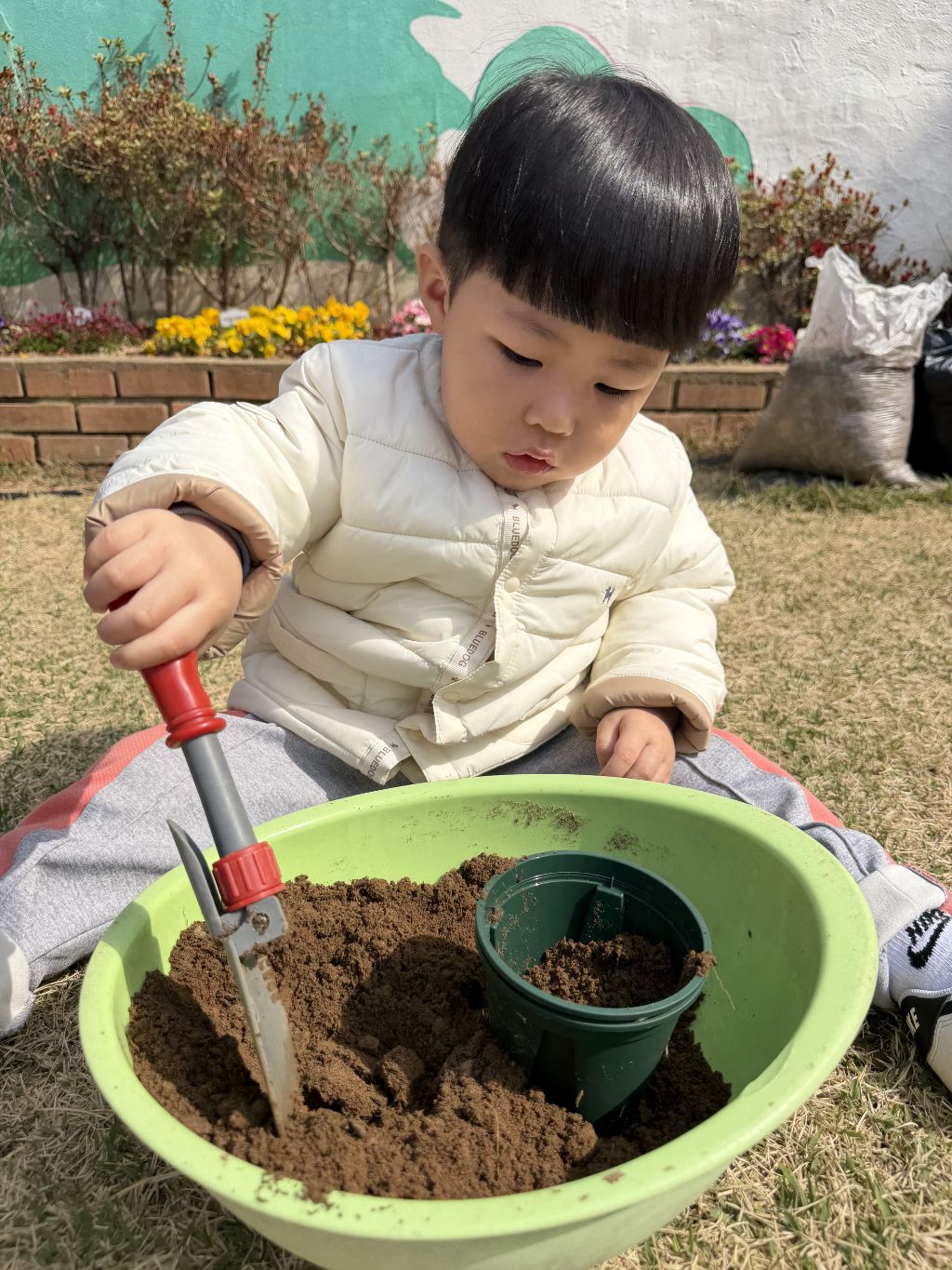 호기심을 보이고, 흙을 살짝 덮어주며
